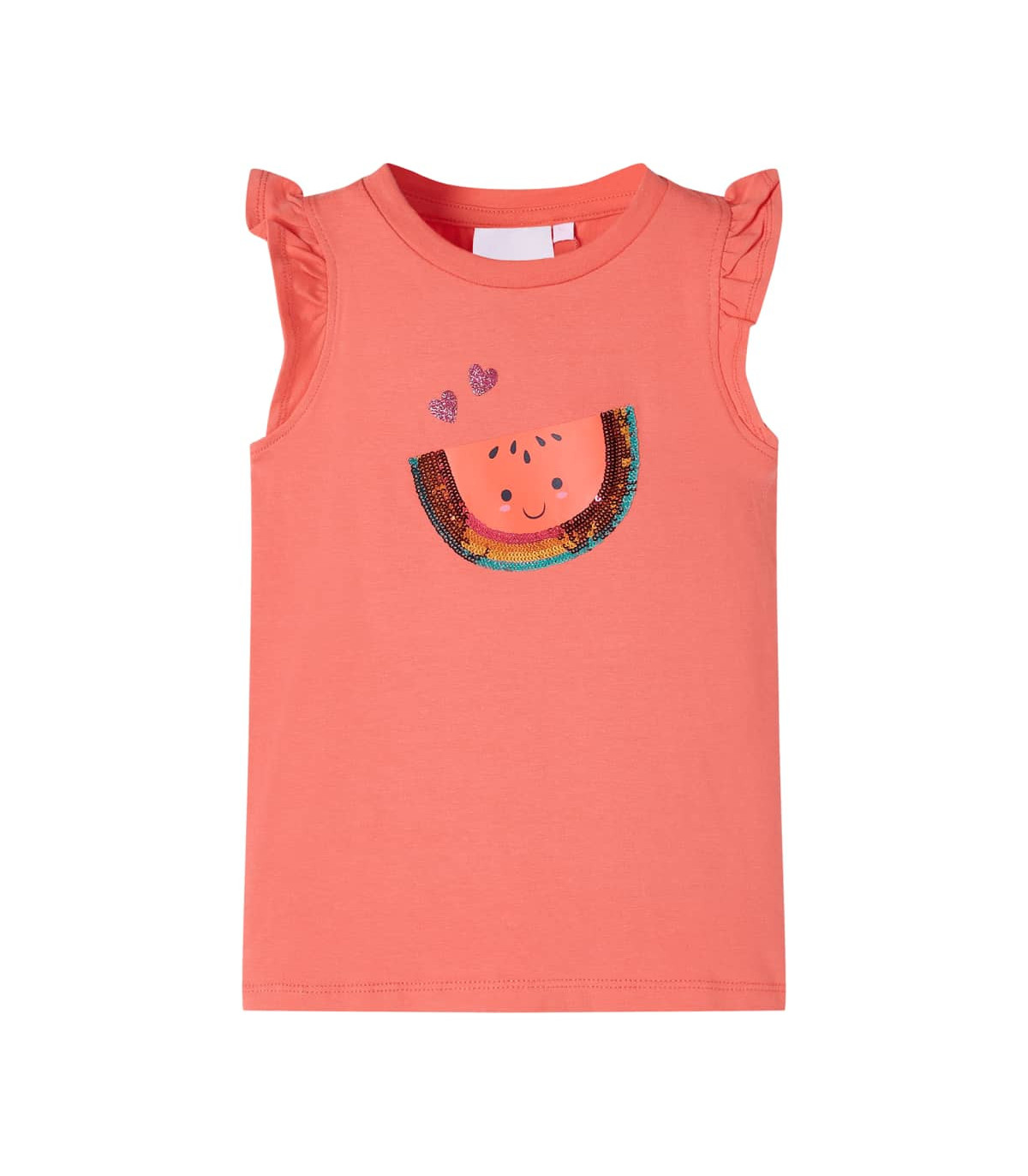 Our children’s clothing line is all about affordable, high-quality, and durable everyday wear for kids aged 1.5 to 10. Our range includes jackets, sweaters, shirts, and many more, with a variety in style, size, and colour. Following the high-quality standard in the market, we are using high-grade materials and advanced manufacturing techniques. This kids' T-shirt has ruffled sleeves, a round neckline, and a straight model. This children's T-shirt features a lovely sequinned watermelon. The children's ruffle sleeve T-shirt is made from soft material that includes 95% cotton and 5% elastane for comfort and breathability. Good to know: The size chart in the picture provides measurements for kids aged 1.5 to 10, covering the height, chest, waist, and hip. You can easily find the right fit for your child.