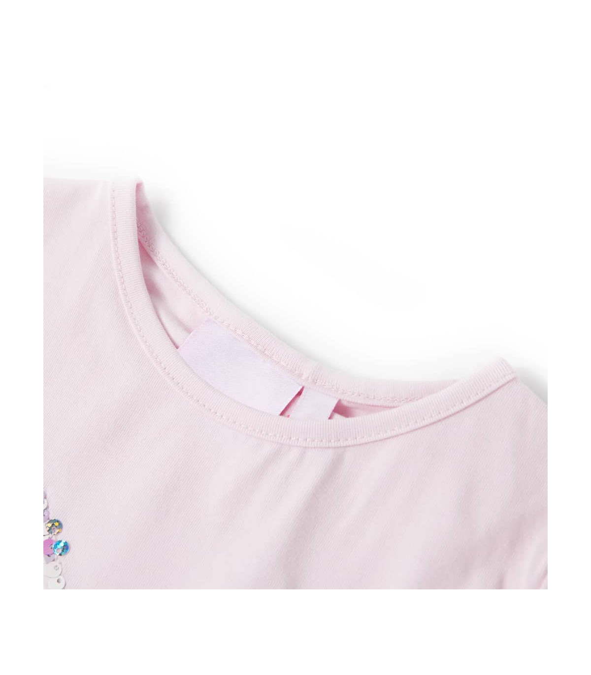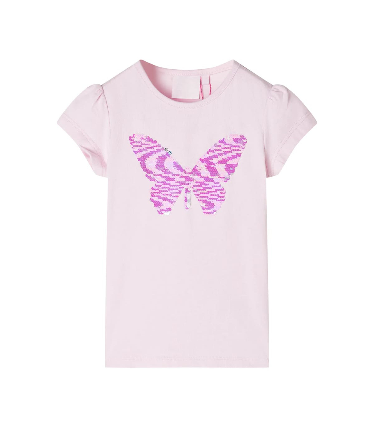 Our children’s clothing line is all about affordable, high-quality, and durable everyday wear for kids aged 1.5 to 10. Our range includes jackets, sweaters, shirts, and many more, with a variety in style, size, and colour. Following the high-quality standard in the market, we are using high-grade materials and advanced manufacturing techniques. This kids' T-shirt has cap sleeves, a round neckline, and a straight model. This children's T-shirt features a sequinned butterfly. The children's cap sleeve T-shirt is made from soft material that includes 95% cotton and 5% elastane for comfort and breathability. Good to know: The size chart in the picture provides measurements for kids aged 1.5 to 10, covering the height, chest, waist, and hip. You can easily find the right fit for your child.