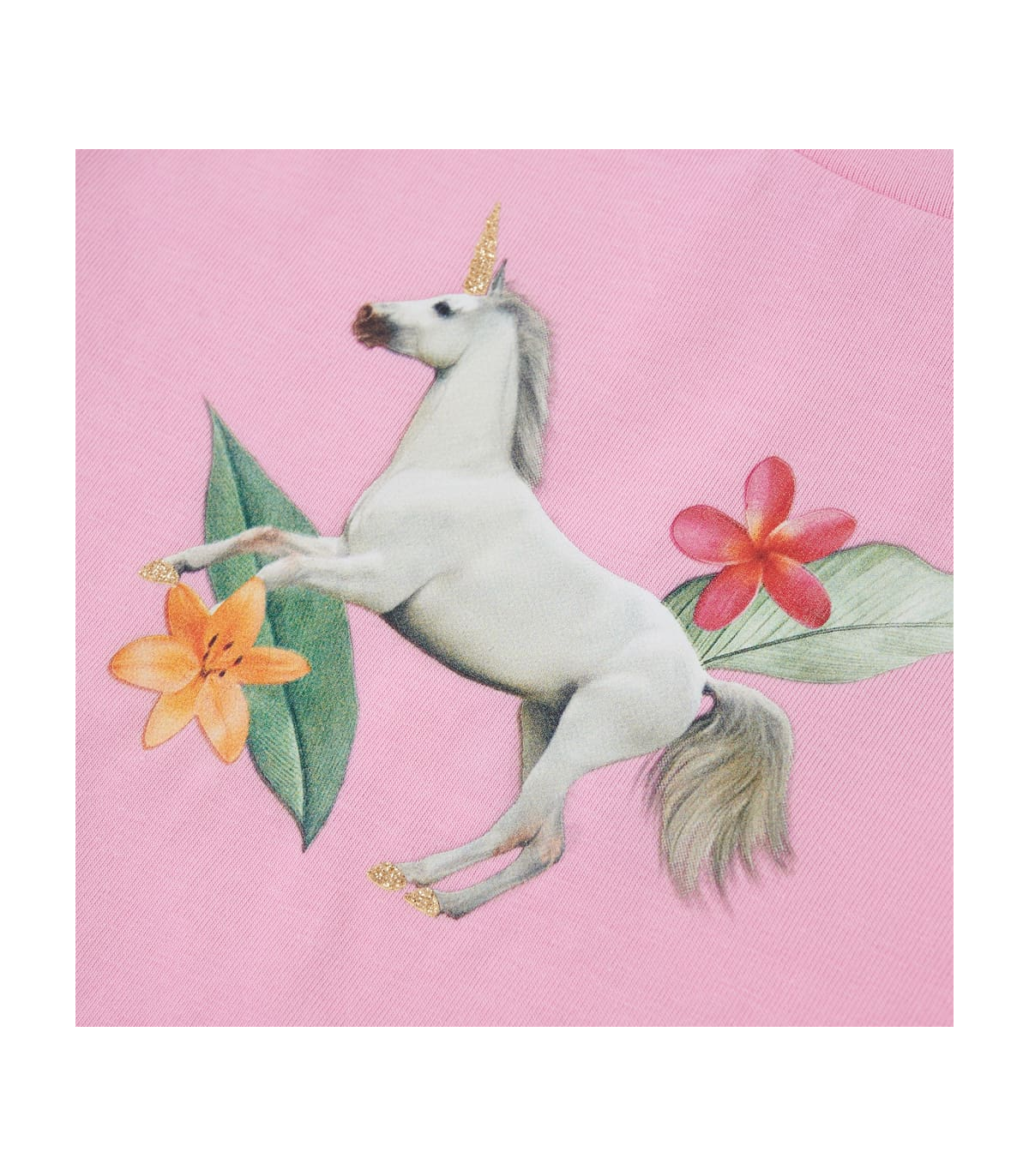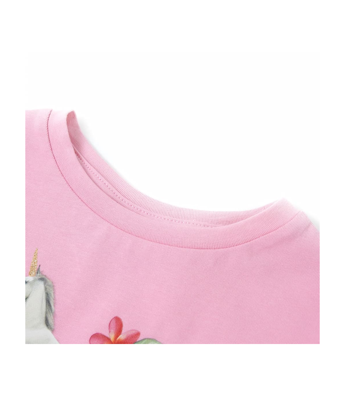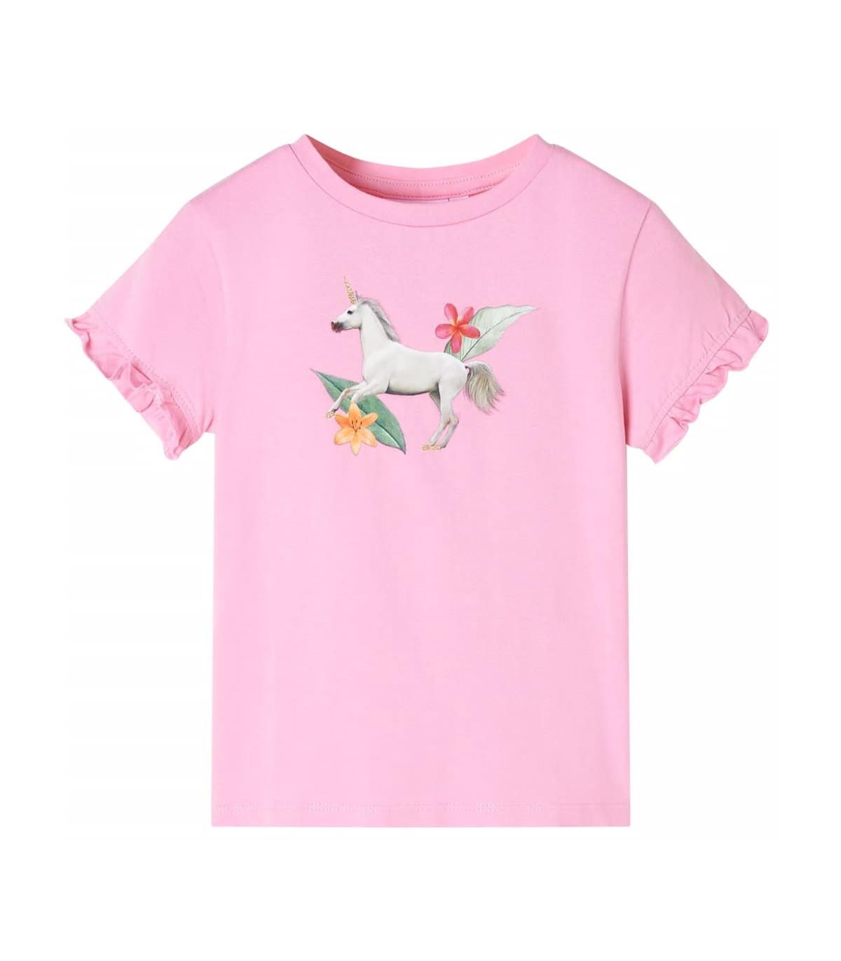 Our children’s clothing line is all about affordable, high-quality, and durable everyday wear for kids aged 1.5 to 10. Our range includes jackets, sweaters, shirts, and many more, with a variety in style, size, and colour. Following the high-quality standard in the market, we are using high-grade materials and advanced manufacturing techniques. This kids' T-shirt has short sleeves with ruffles, a round neckline, and a straight model. This children's T-shirt features a beautiful unicorn with leaves and flowers. The children's short sleeve T-shirt is made from soft material that includes 95% cotton and 5% elastane for comfort and breathability. Good to know: The size chart in the picture provides measurements for kids aged 1.5 to 10, covering the height, chest, waist, and hip. You can easily find the right fit for your child.