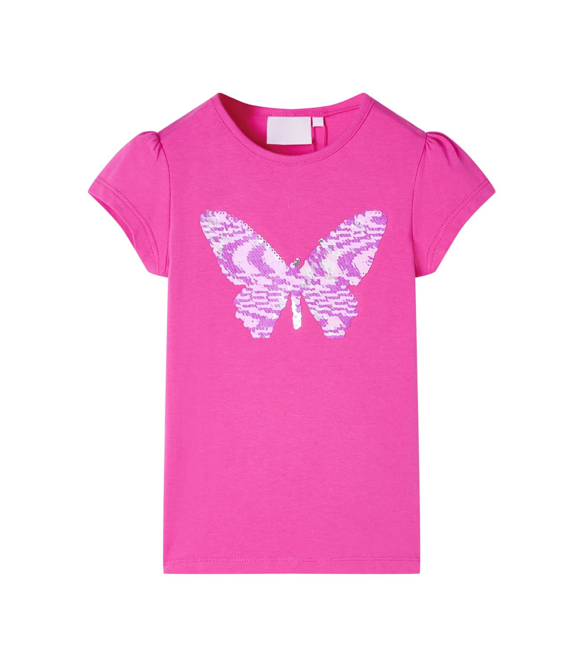 Our children’s clothing line is all about affordable, high-quality, and durable everyday wear for kids aged 1.5 to 10. Our range includes jackets, sweaters, shirts, and many more, with a variety in style, size, and colour. Following the high-quality standard in the market, we are using high-grade materials and advanced manufacturing techniques. This kids' T-shirt has cap sleeves, a round neckline, and a straight model. This children's T-shirt features a sequinned butterfly. The children's cap sleeve T-shirt is made from soft material that includes 95% cotton and 5% elastane for comfort and breathability. Good to know: The size chart in the picture provides measurements for kids aged 1.5 to 10, covering the height, chest, waist, and hip. You can easily find the right fit for your child.