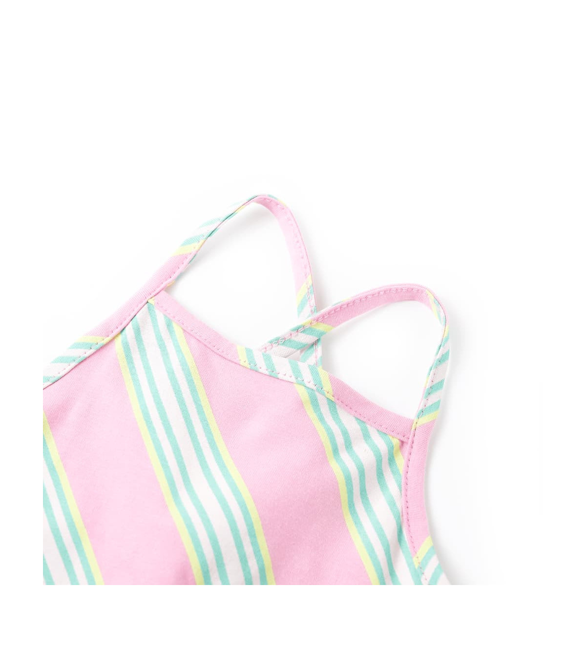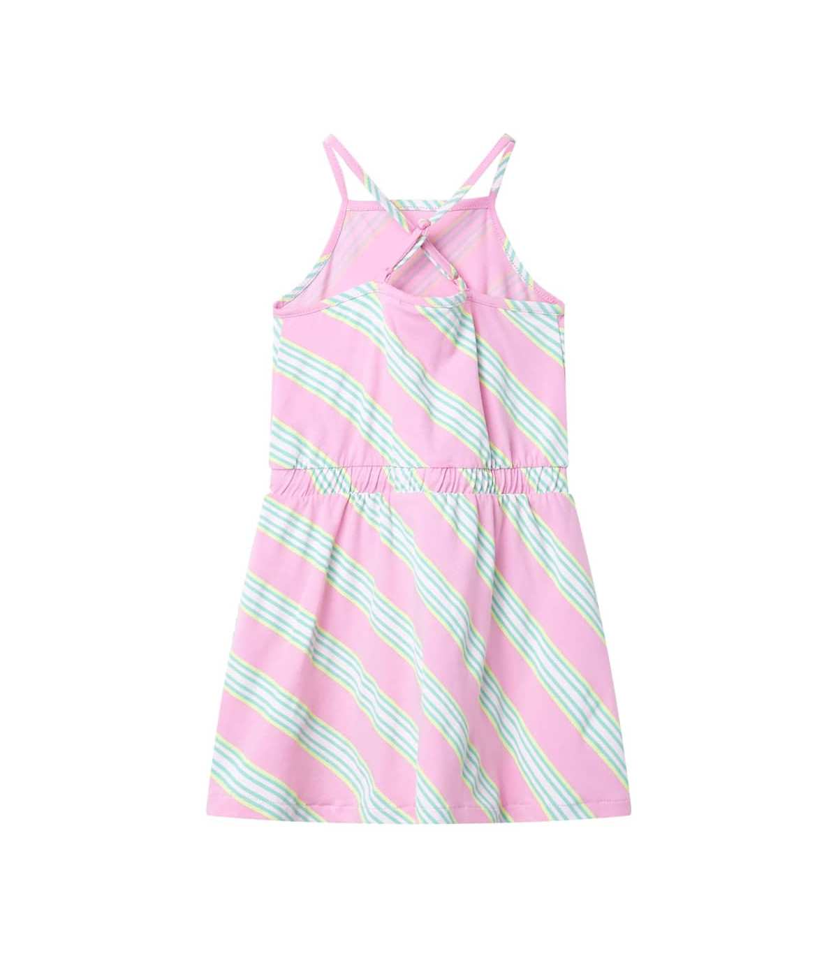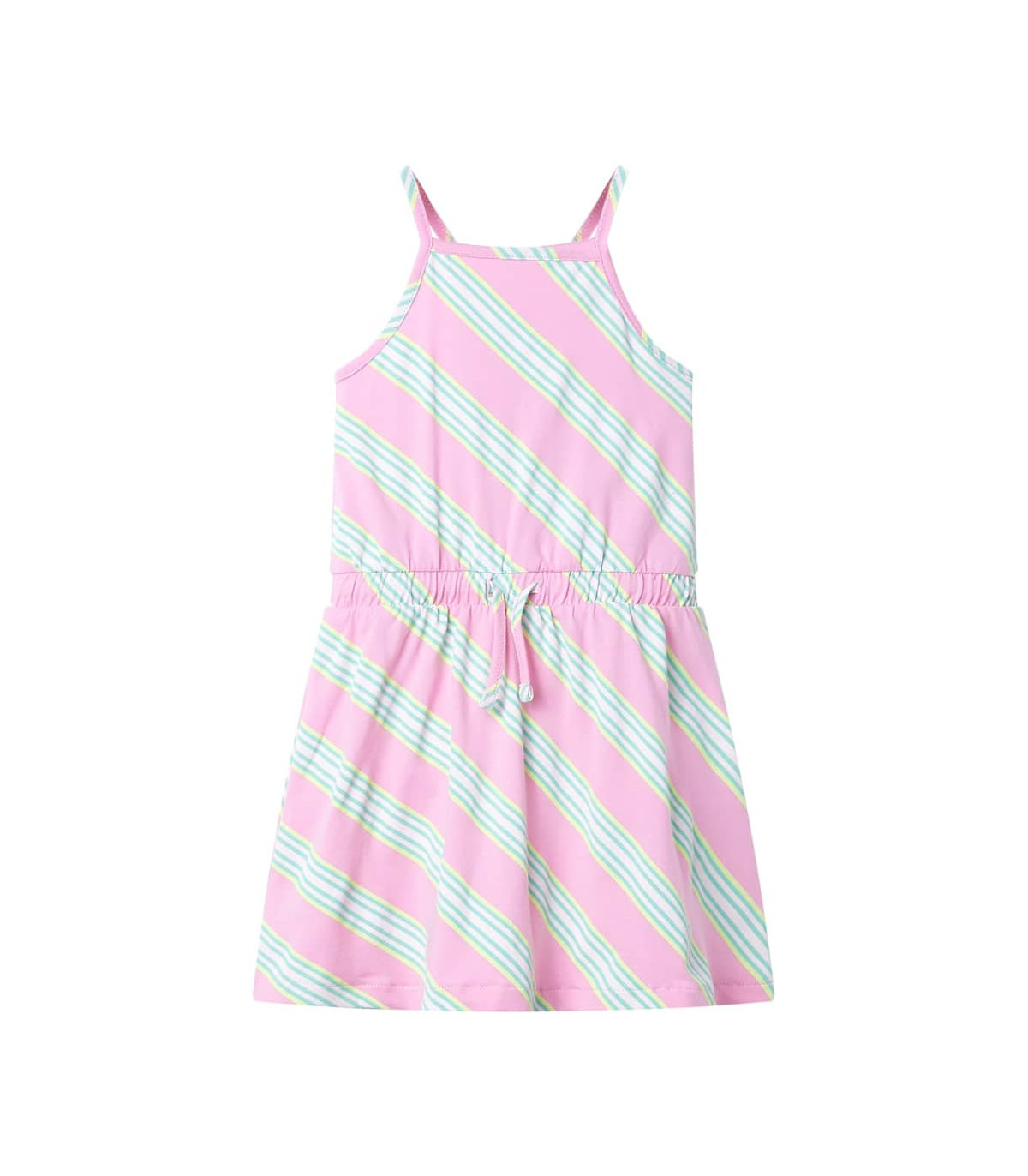 Our children's clothing line is all about affordable, high-quality, and durable everyday wear for kids aged 1.5 to 10. Our range includes jackets, sweaters, shirts, and many more, with a variety in style, size, and colour. Following the high-quality standard in the market, we are using high-grade materials and advanced manufacturing techniques. This kids' dress has a drawstring waistband and straps with criss-cross back detail. This sleeveless children's dress is printed with diagonal stripes all over. The children’s short dress is made from soft material that includes 95% cotton and 5% elastane for comfort and breathability. Good to know: This size chart in the picture provides measurements for kids aged 1.5 to 10, covering the height, chest, waist, and hip. You can easily find the right fit for your child.
