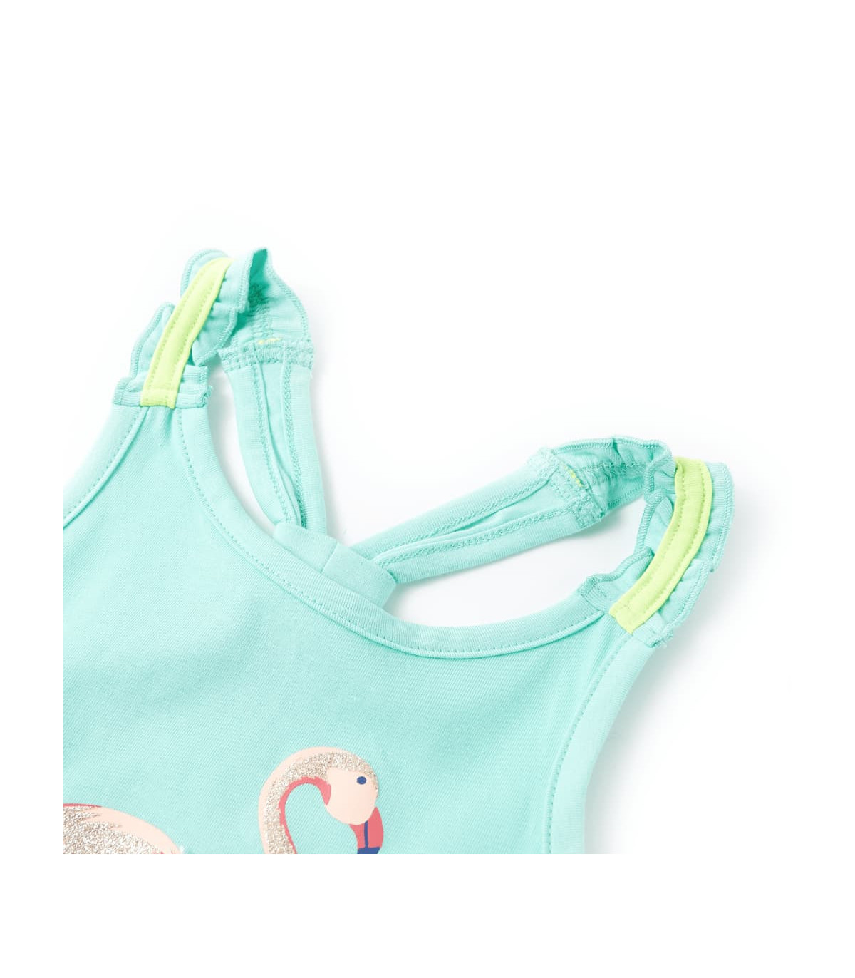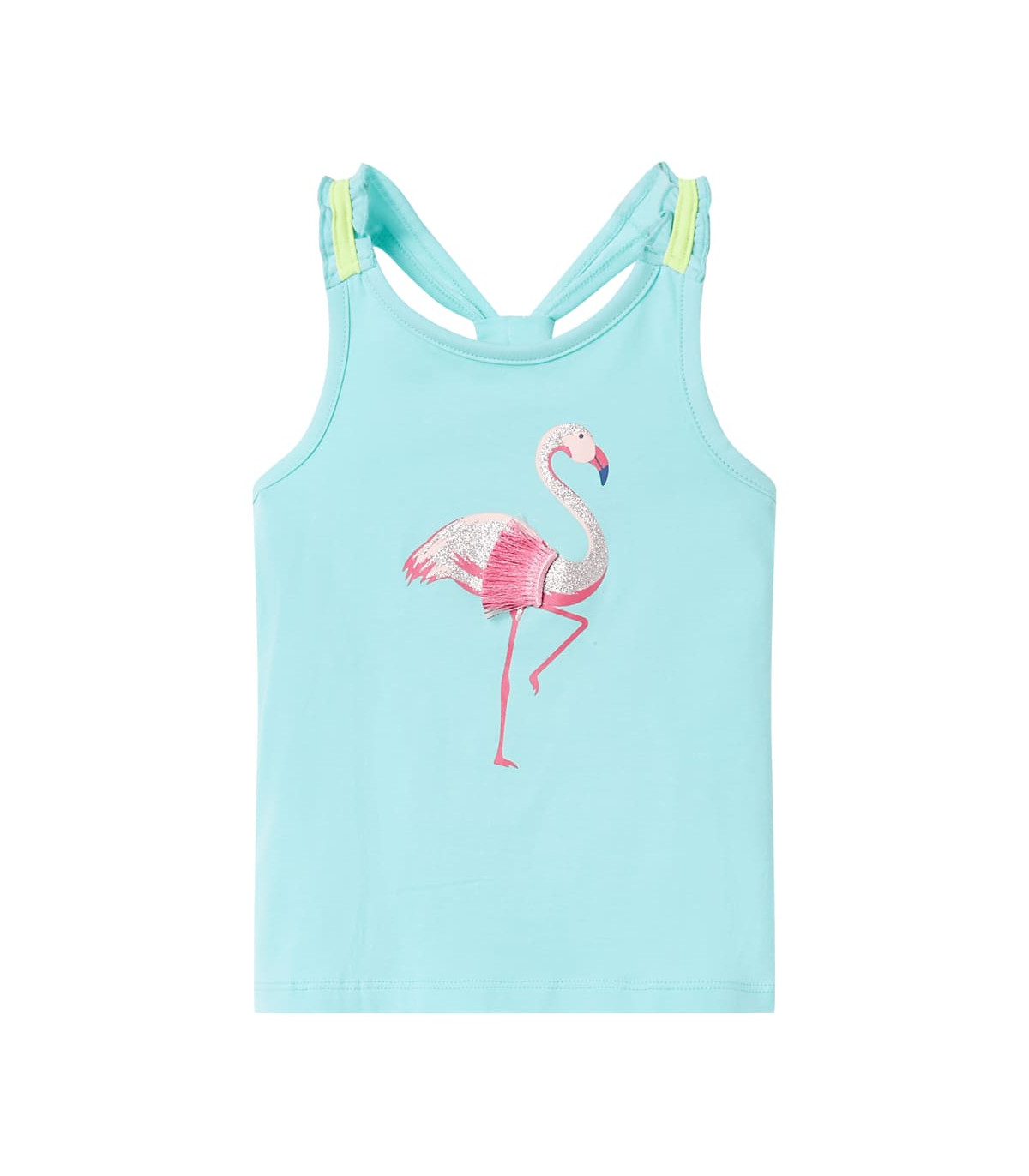 Our children's clothing line is all about affordable, high-quality, and durable everyday wear for kids aged 1.5 to 10. Our range includes jackets, sweaters, shirts, and many more, with a variety in style, size, and colour. Following the high-quality standard in the market, we are using high-grade materials and advanced manufacturing techniques. This kids' tank top has elastic shoulder straps and a straight fit. The glitter flamingo with fancy tape makes the children's tank top look elegant and beautiful. The tank top for kids is made of 95% cotton and 5% elastane for a soft and comfortable touch. Good to know: This size chart in the picture provides measurements for kids aged 1.5 to 10, covering the height, chest, waist, and hip. You can easily find the right fit for your child.