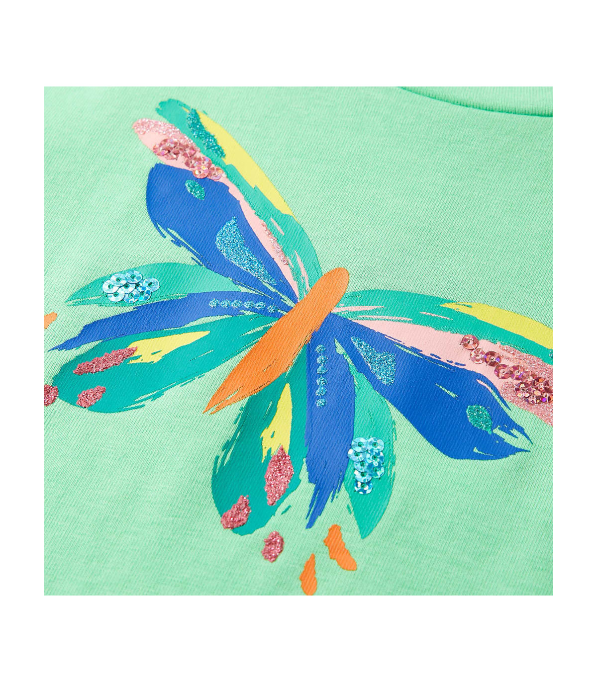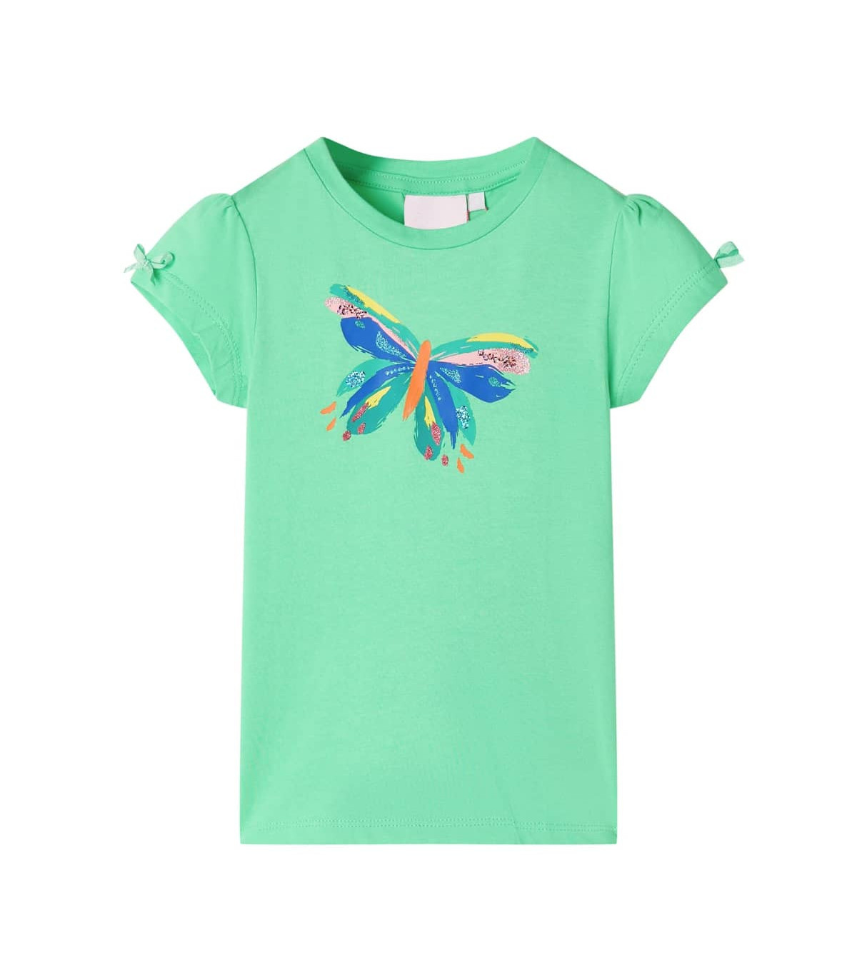 Our children's clothing line is all about affordable, high-quality, and durable everyday wear for kids aged 1.5 to 10. Our range includes jackets, sweaters, shirts, and many more, with a variety in style, size, and colour. Following the high-quality standard in the market, we are using high-grade materials and advanced manufacturing techniques. This kids' T-shirt has short sleeves, a round neckline, and a straight model. This T-shirt features a colourful butterfly with sequins on the chest and small bow embellishments on the sleeves. The children's short sleeve T-shirt is made of 95% cotton and 5% elastane for comfort and breathability. Good to know: The size chart in the picture provides measurements for kids aged 1.5 to 10, covering the height, chest, waist, and hip. You can easily find the right fit for your child.