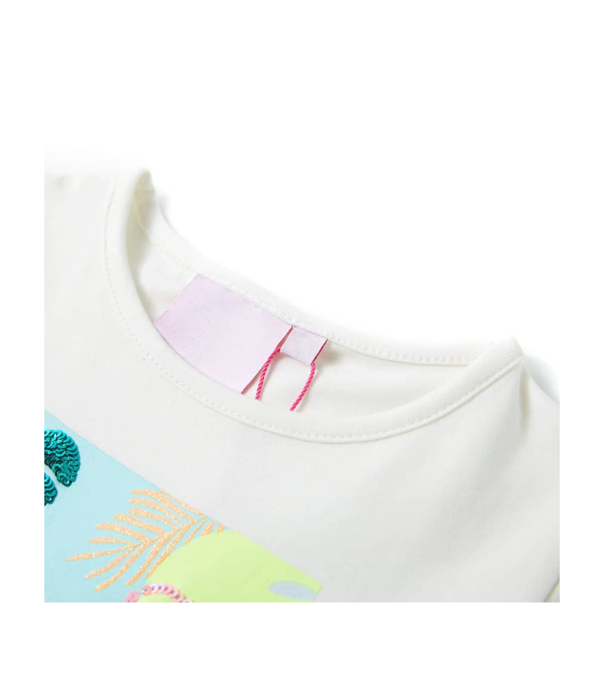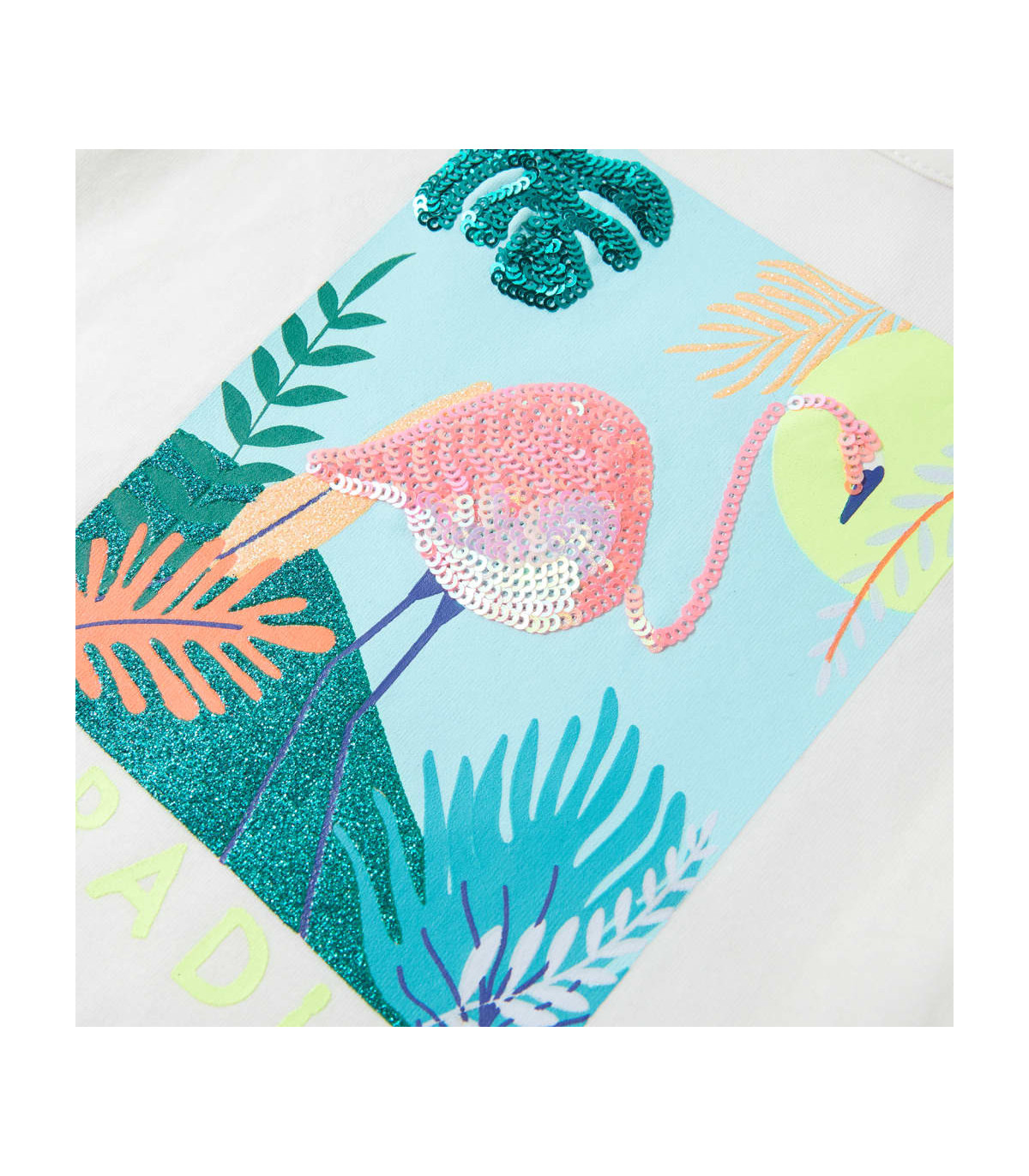 Our children's clothing line is all about affordable, high-quality, and durable everyday wear for kids aged 1.5 to 10. Our range includes jackets, sweaters, shirts, and many more, with a variety in style, size, and colour. Following the high-quality standard in the market, we are using high-grade materials and advanced manufacturing techniques. This kids' T-shirt has short sleeves, a round neckline, and a straight model. This T-shirt features a sequin flamingo surrounded by the fronds. This T-shirt for kids is also printed with "PARADISE" words. The children's short sleeve T-shirt is made of 95% cotton and 5% elastane for comfort and breathability. Good to know: The size chart in the picture provides measurements for kids aged 1.5 to 10, covering the height, chest, waist, and hip. You can easily find the right fit for your child.