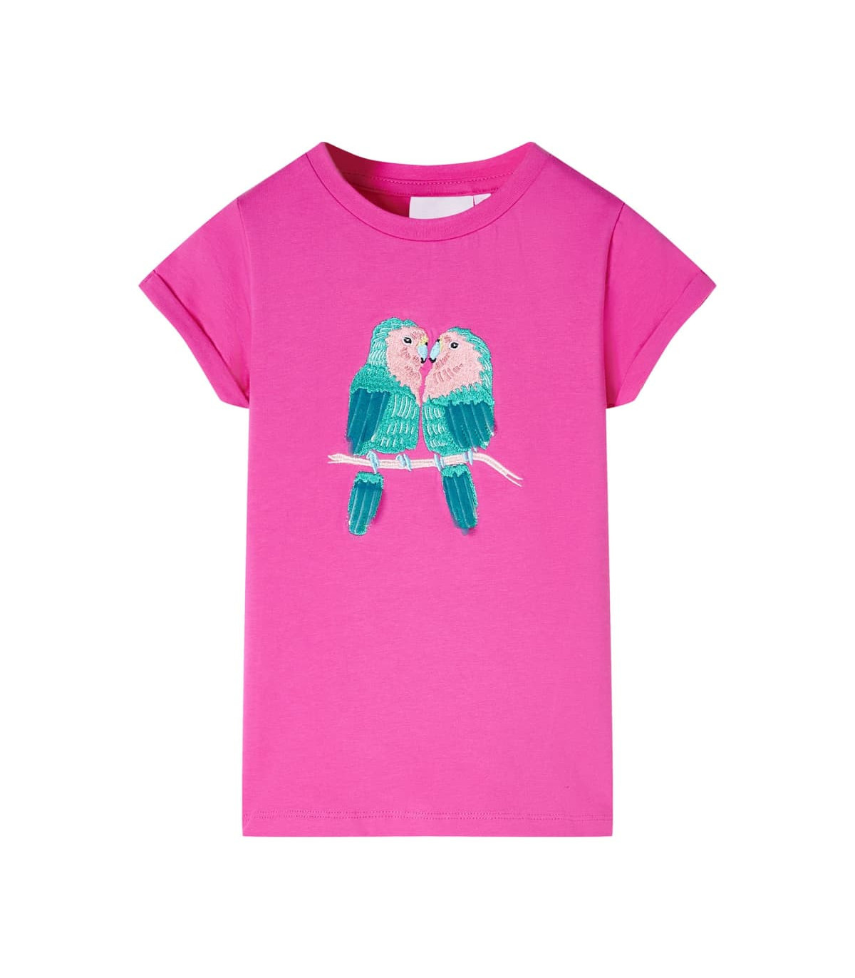 Our children’s clothing line is all about affordable, high-quality, and durable everyday wear for kids aged 1.5 to 10. Our range includes jackets, sweaters, shirts, and many more, with a variety in style, size, and colour. Following the high-quality standard in the market, we are using high-grade materials and advanced manufacturing techniques. This kids' T-shirt has short sleeves, a round neckline, and a straight model. The children's T-shirt features 2 cute parrots on the front. The T-shirt for kids is made of cotton and elastane for a soft and comfortable touch. Good to know: This size chart in the picture provides measurements for kids aged 1.5 to 10, covering the height, chest, waist, and hip. You can easily find the right fit for your child.
