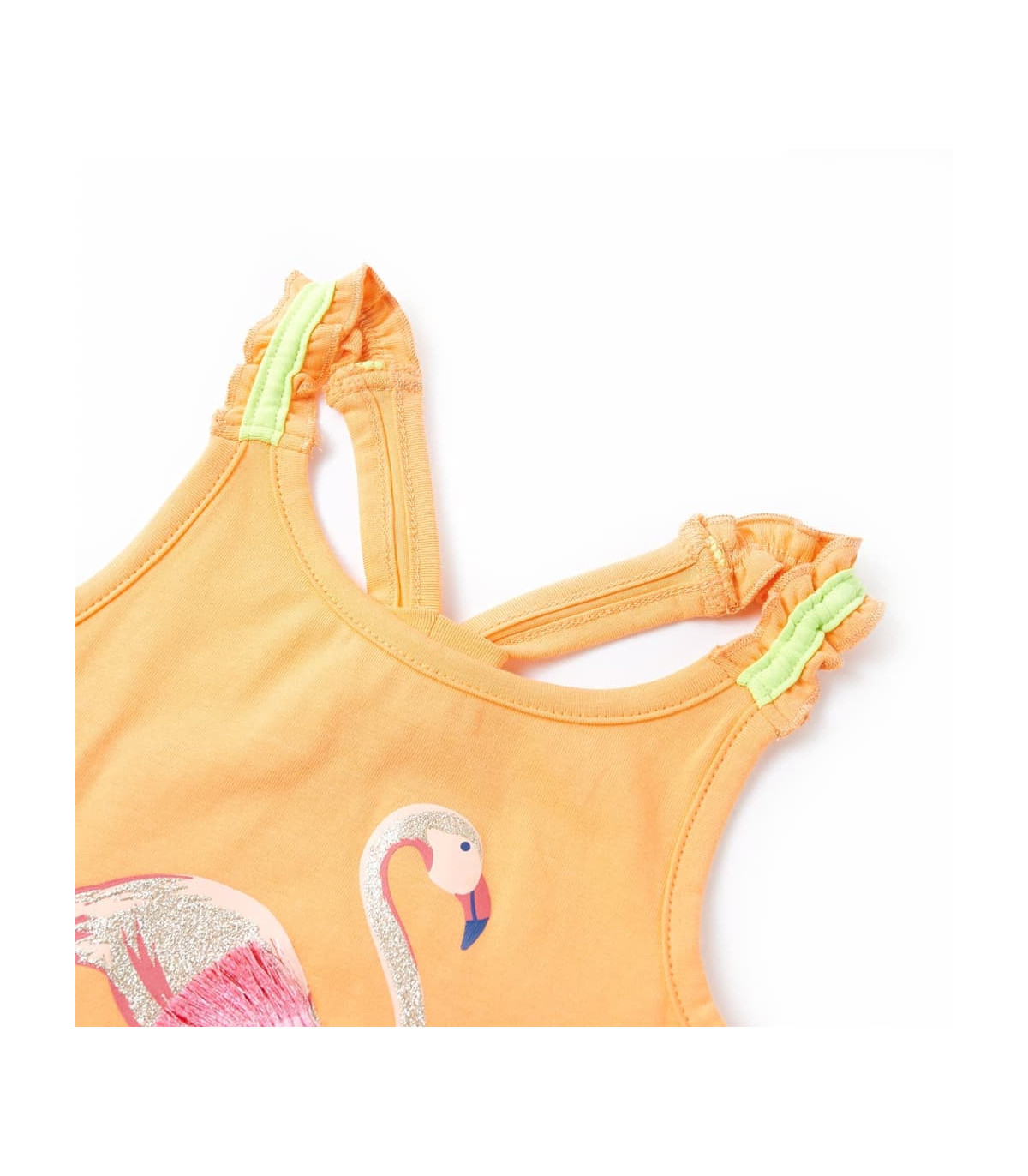 Our children's clothing line is all about affordable, high-quality, and durable everyday wear for kids aged 1.5 to 10. Our range includes jackets, sweaters, shirts, and many more, with a variety in style, size, and colour. Following the high-quality standard in the market, we are using high-grade materials and advanced manufacturing techniques. This kids' tank top has elastic shoulder straps and a straight fit. The glitter flamingo with fancy tape makes the children's tank top look elegant and beautiful. The tank top for kids is made of 95% cotton and 5% elastane for a soft and comfortable touch. Good to know: This size chart in the picture provides measurements for kids aged 1.5 to 10, covering the height, chest, waist, and hip. You can easily find the right fit for your child.