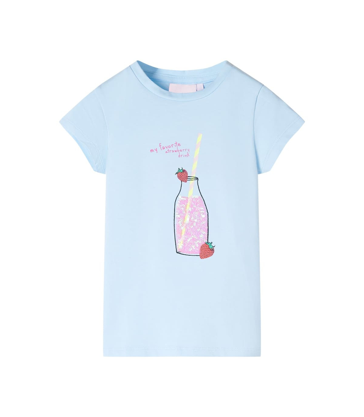 Our children’s clothing line is all about affordable, high-quality, and durable everyday wear for kids aged 1.5 to 10. Our range includes jackets, sweaters, shirts, and many more, with a variety in style, size, and colour. Following the high-quality standard in the market, we are using high-grade materials and advanced manufacturing techniques. This kids' T-shirt has short sleeves, a round neckline, and a straight model. The children's T-shirt features a bottle of strawberry drink on the front. The T-shirt for kids is made of cotton and elastane for a soft and comfortable touch. Good to know: This size chart in the picture provides measurements for kids aged 1.5 to 10, covering the height, chest, waist, and hip. You can easily find the right fit for your child.