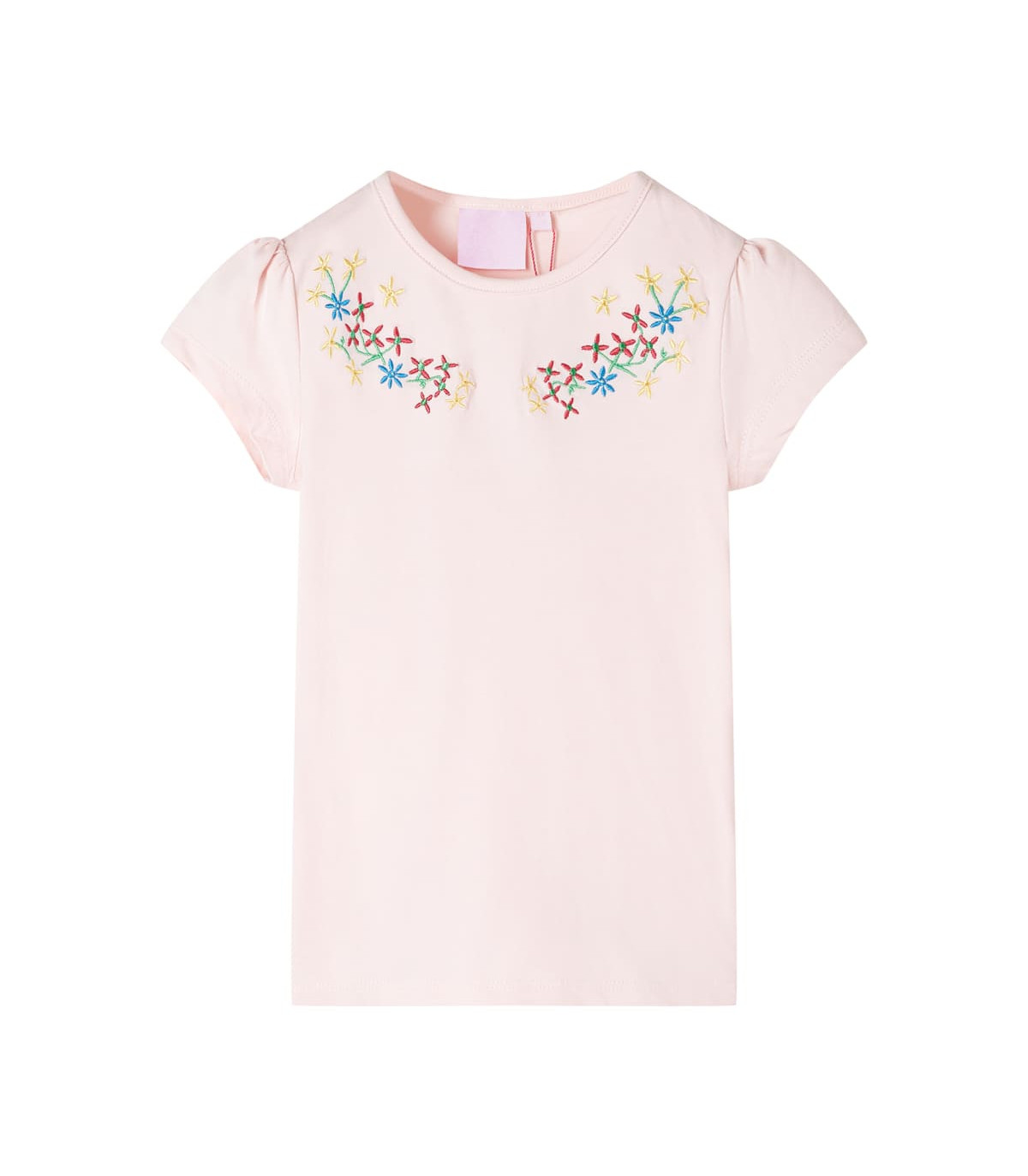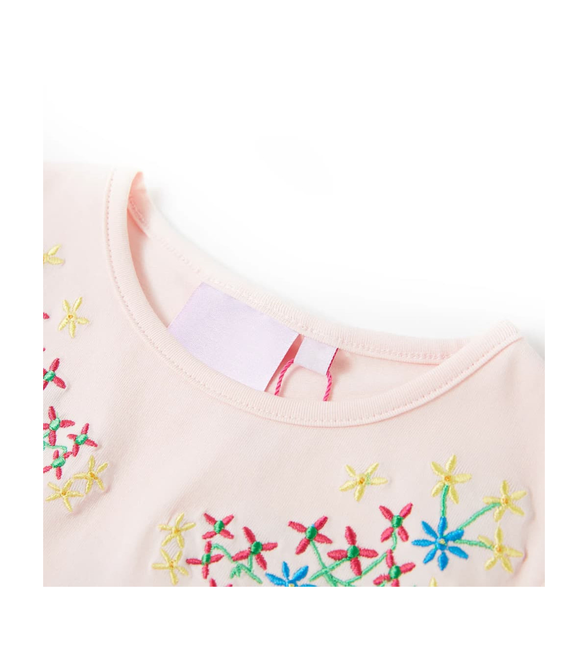 Our children’s clothing line is all about affordable, high-quality, and durable everyday wear for kids aged 1.5 to 10. Our range includes jackets, sweaters, shirts, and many more, with a variety in style, size, and colour. Following the high-quality standard in the market, we are using high-grade materials and advanced manufacturing techniques. This kids' T-shirt has short sleeves, a round neckline, and a straight model. The children's T-shirt features flowers on the front. The T-shirt for kids is made of cotton and elastane for a soft and comfortable touch. Good to know: This size chart in the picture provides measurements for kids aged 1.5 to 10, covering the height, chest, waist, and hip. You can easily find the right fit for your child.