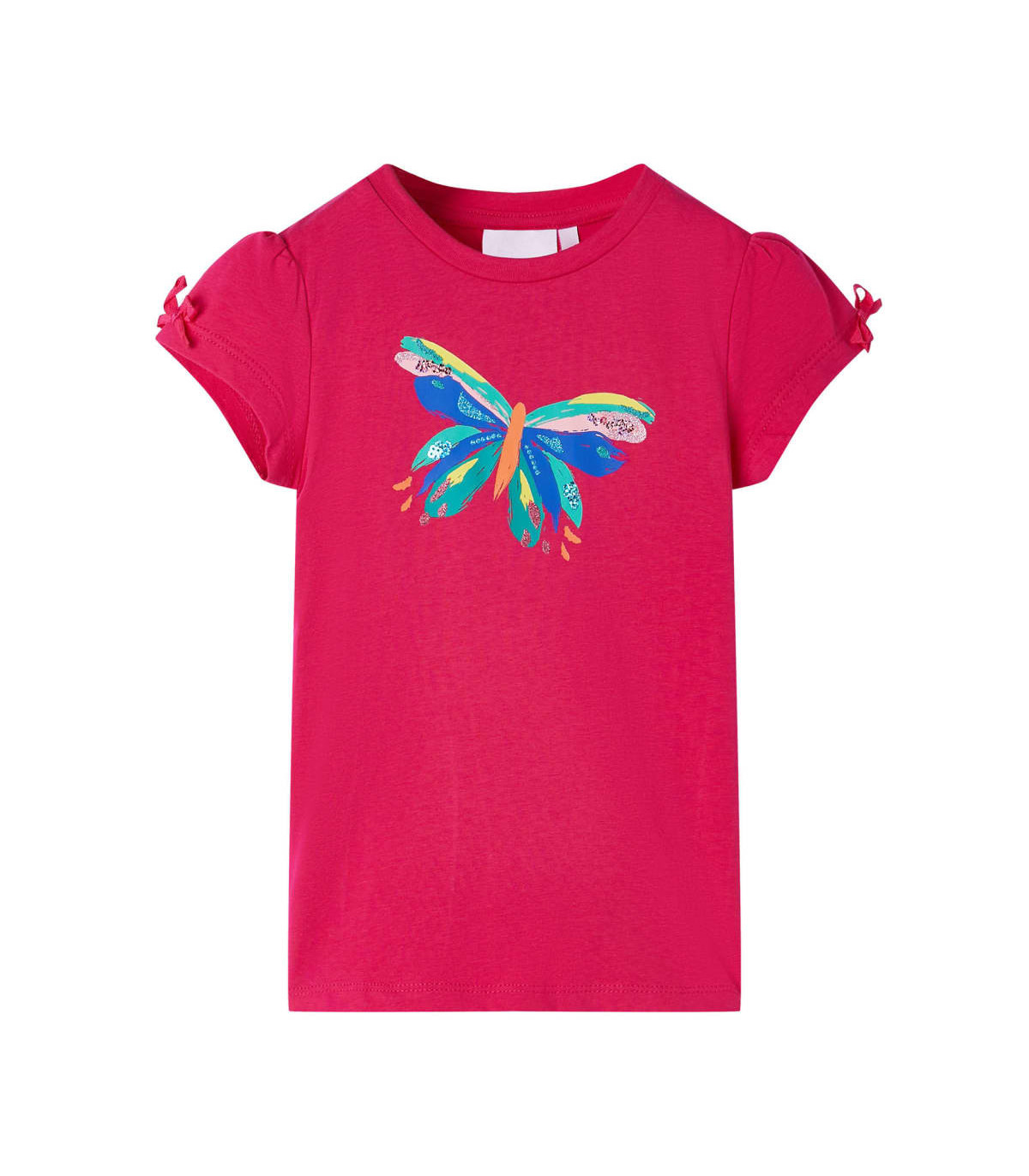 Our children's clothing line is all about affordable, high-quality, and durable everyday wear for kids aged 1.5 to 10. Our range includes jackets, sweaters, shirts, and many more, with a variety in style, size, and colour. Following the high-quality standard in the market, we are using high-grade materials and advanced manufacturing techniques. This kids' T-shirt has short sleeves, a round neckline, and a straight model. This T-shirt features a colourful butterfly with sequins on the chest and small bow embellishments on the sleeves. The children's short sleeve T-shirt is made of 95% cotton and 5% elastane for comfort and breathability. Good to know: The size chart in the picture provides measurements for kids aged 1.5 to 10, covering the height, chest, waist, and hip. You can easily find the right fit for your child.