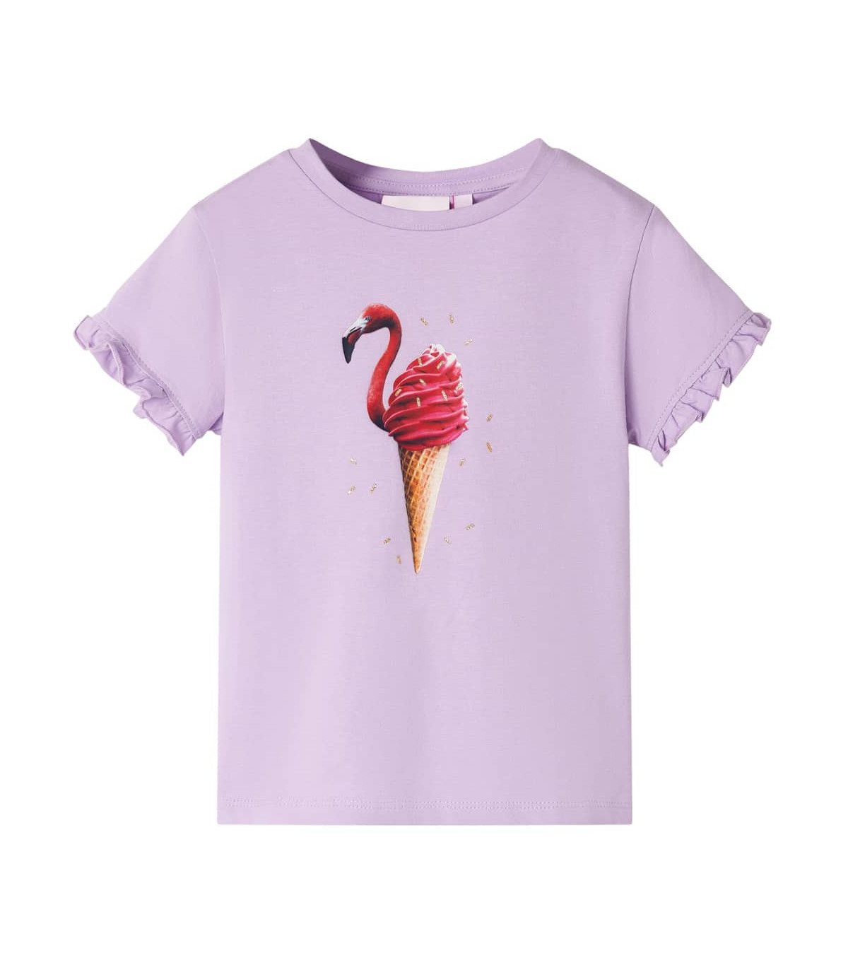 Our children's clothing line is all about affordable, high-quality, and durable everyday wear for kids aged 1.5 to 10. Our range includes jackets, sweaters, shirts, and many more, with a variety in style, size, and colour. Following the high-quality standard in the market, we are using high-grade materials and advanced manufacturing techniques. This kids' T-shirt has short sleeves with frilly edges, a round neckline, and a straight model. This T-shirt features a flamingo ice cream for an eye-catching and interesting look! The children's short sleeve T-shirt is made of 95% cotton and 5% elastane for comfort and breathability. Good to know: The size chart in the picture provides measurements for kids aged 1.5 to 10, covering the height, chest, waist, and hip. You can easily find the right fit for your child.