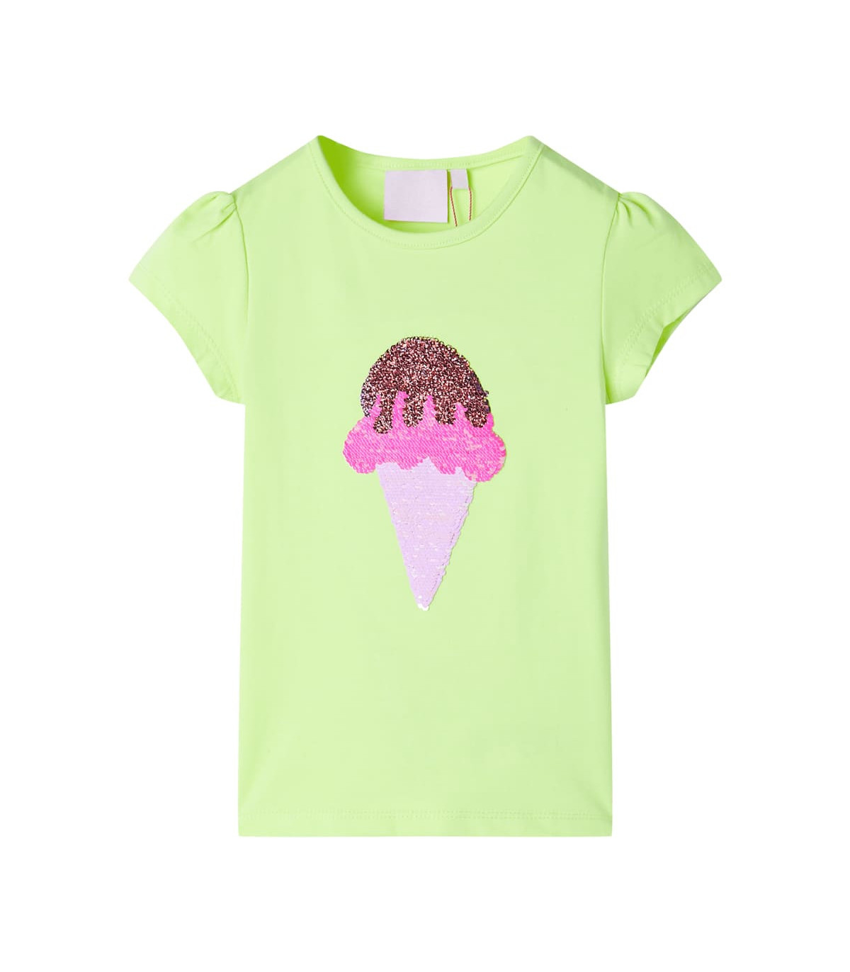 Our children's clothing line is all about affordable, high-quality, and durable everyday wear for kids aged 1.5 to 10. Our range includes jackets, sweaters, shirts, and many more, with a variety in style, size, and colour. Following the high-quality standard in the market, we are using high-grade materials and advanced manufacturing techniques. This kids' T-shirt has short sleeves, a round neckline, and a straight model. This T-shirt features a reversible sequin ice cream, bringing a touch of magic to the front. The children's short sleeve T-shirt is made from soft material with cotton, polyester and elastane for comfort and breathability. Good to know: The size chart in the picture provides measurements for kids aged 1.5 to 10, covering the height, chest, waist, and hip. You can easily find the right fit for your child.