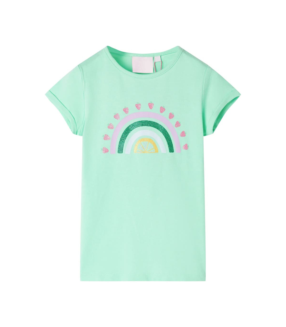 Our children's clothing line is all about affordable, high-quality, and durable everyday wear for kids aged 1.5 to 10. Our range includes jackets, sweaters, shirts, and many more, with a variety in style, size, and colour. Following the high-quality standard in the market, we are using high-grade materials and advanced manufacturing techniques. This kids' T-shirt has short sleeves with sewn-in turn-ups, a round neckline, and a straight model. This T-shirt is printed with a sparkling rainbow pattern with strawberries dotted around the outer edge of the rainbow. The children's short sleeve T-shirt is made of 95% cotton and 5% elastane for comfort and breathability. Good to know: The size chart in the picture provides measurements for kids aged 1.5 to 10, covering the height, chest, waist, and hip. You can easily find the right fit for your child.