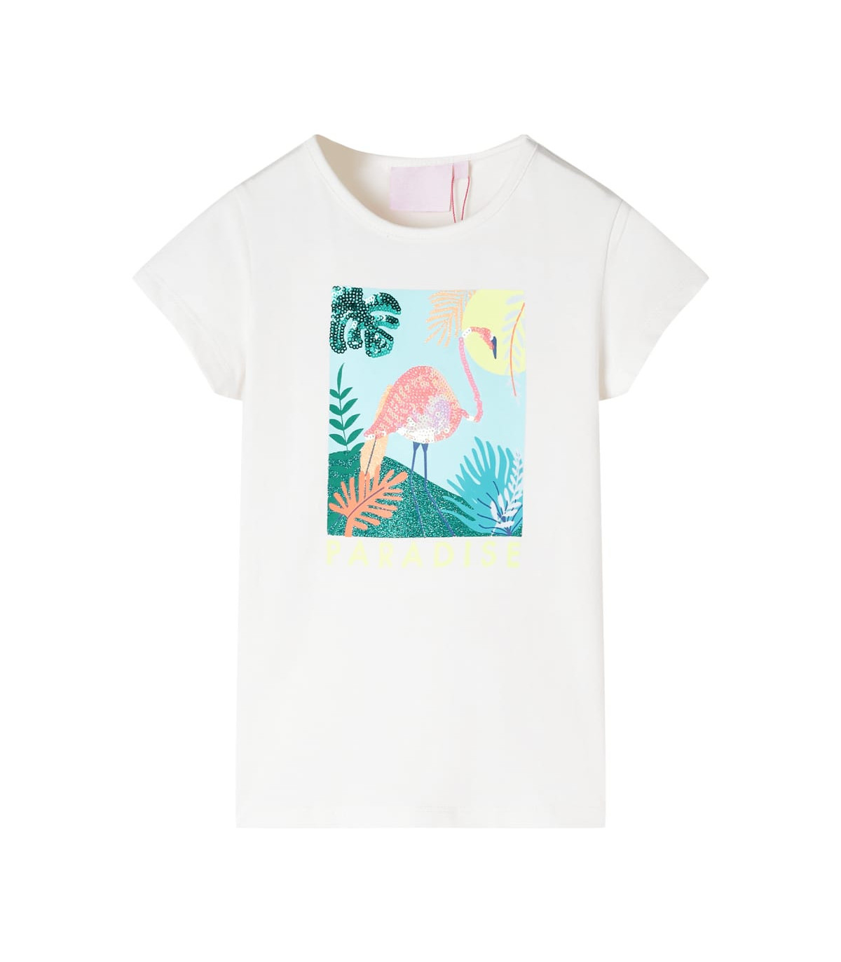 Our children's clothing line is all about affordable, high-quality, and durable everyday wear for kids aged 1.5 to 10. Our range includes jackets, sweaters, shirts, and many more, with a variety in style, size, and colour. Following the high-quality standard in the market, we are using high-grade materials and advanced manufacturing techniques. This kids' T-shirt has short sleeves, a round neckline, and a straight model. This T-shirt features a sequin flamingo surrounded by the fronds. This T-shirt for kids is also printed with "PARADISE" words. The children's short sleeve T-shirt is made of 95% cotton and 5% elastane for comfort and breathability. Good to know: The size chart in the picture provides measurements for kids aged 1.5 to 10, covering the height, chest, waist, and hip. You can easily find the right fit for your child.