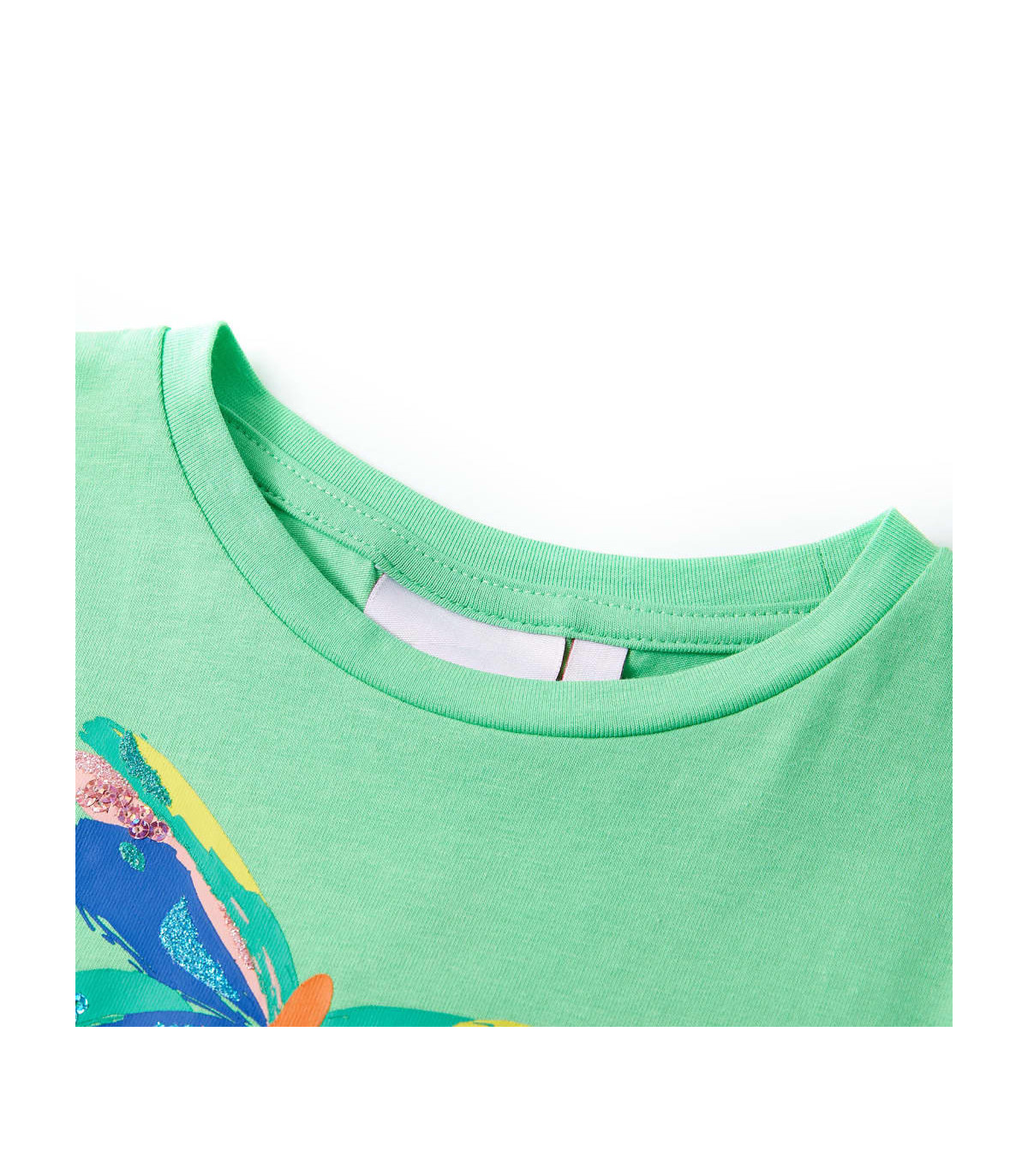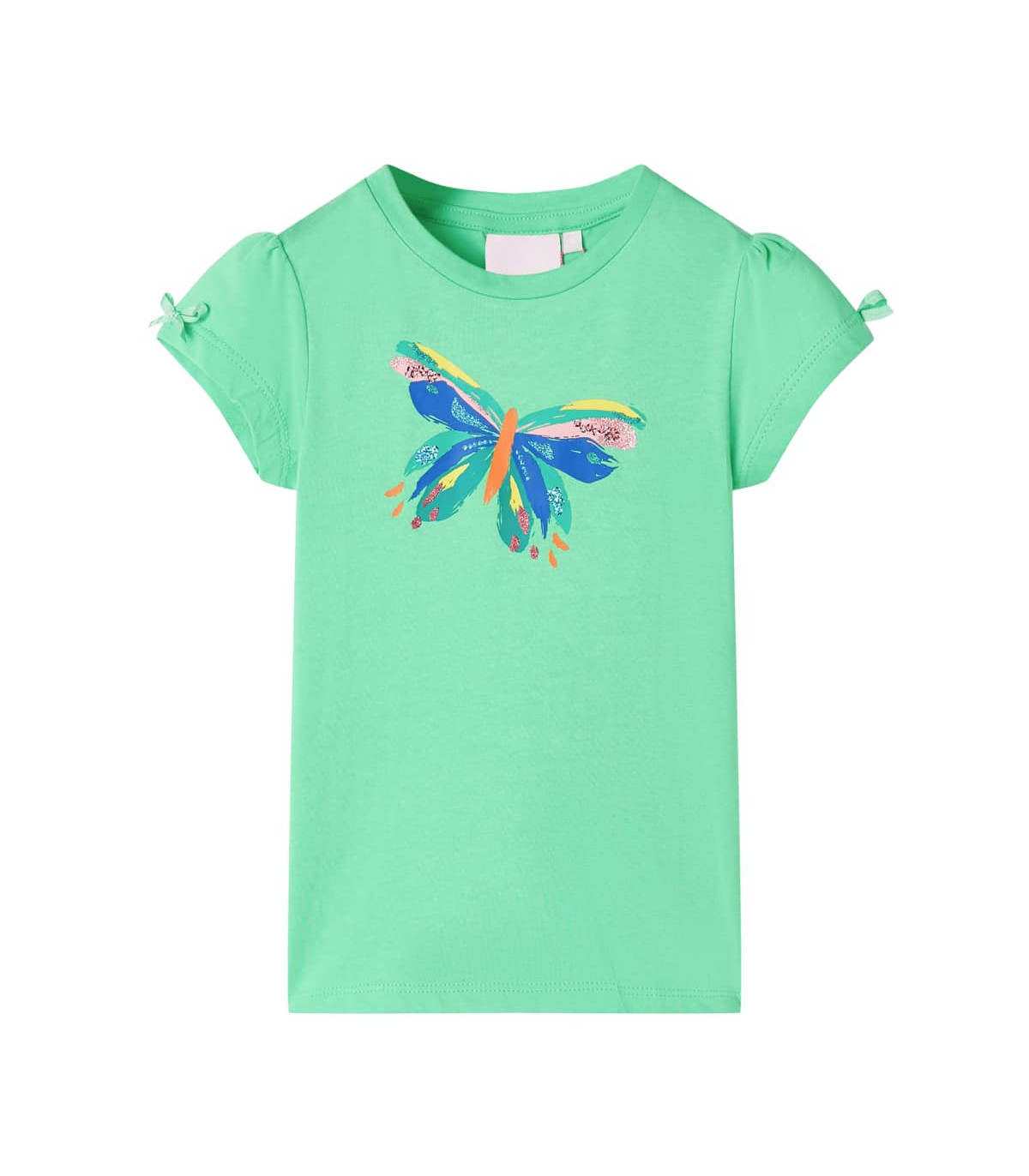 Our children's clothing line is all about affordable, high-quality, and durable everyday wear for kids aged 1.5 to 10. Our range includes jackets, sweaters, shirts, and many more, with a variety in style, size, and colour. Following the high-quality standard in the market, we are using high-grade materials and advanced manufacturing techniques. This kids' T-shirt has short sleeves, a round neckline, and a straight model. This T-shirt features a colourful butterfly with sequins on the chest and small bow embellishments on the sleeves. The children's short sleeve T-shirt is made of 95% cotton and 5% elastane for comfort and breathability. Good to know: The size chart in the picture provides measurements for kids aged 1.5 to 10, covering the height, chest, waist, and hip. You can easily find the right fit for your child.