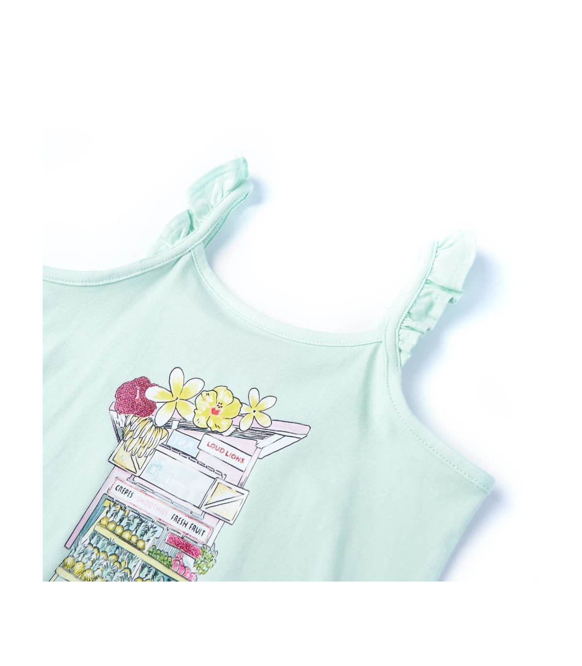 Our children’s clothing line is all about affordable, high-quality, and durable everyday wear for kids aged 1.5 to 10. Our range includes jackets, sweaters, shirts, and many more, with a variety in style, size, and colour. Following the high-quality standard in the market, we are using high-grade materials and advanced manufacturing techniques. This kids' tank top has nice ruffles on the shoulder straps and a straight fit. The tank top for kids features a fruit shop on the front. The children's tank top is made of cotton and elastane for a soft and comfortable touch. Good to know: This size chart in the picture provides measurements for kids aged 1.5 to 10, covering the height, chest, waist, and hip. You can easily find the right fit for your child.