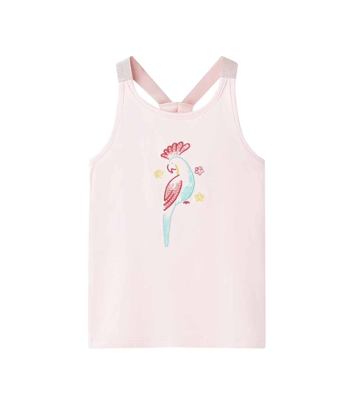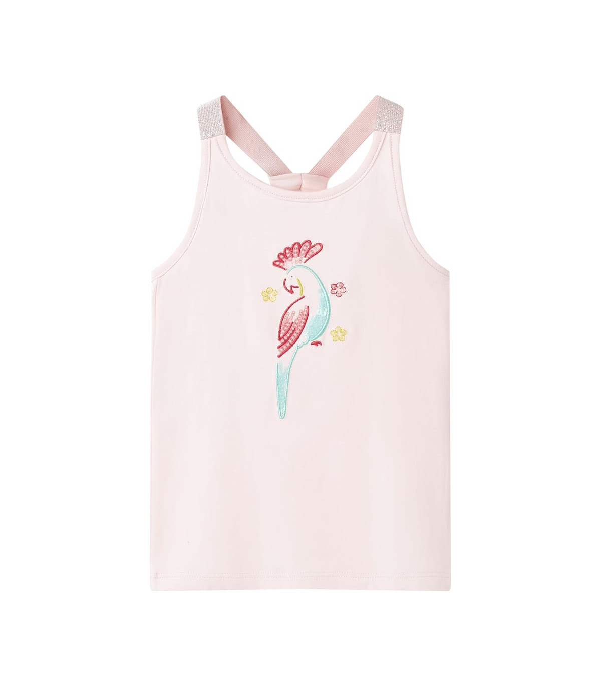 Our children's clothing line is all about affordable, high-quality, and durable everyday wear for kids aged 1.5 to 10. Our range includes jackets, sweaters, shirts, and many more, with a variety in style, size, and colour. Following the high-quality standard in the market, we are using high-grade materials and advanced manufacturing techniques. This kids' tank top has elastic shoulder straps and a straight fit. The embroidery parrot and flowers make the children's tank top look elegant and beautiful. The tank top for kids is made of 95% cotton and 5% elastane for a soft and comfortable touch. Good to know: This size chart in the picture provides measurements for kids aged 1.5 to 10, covering the height, chest, waist, and hip. You can easily find the right fit for your child.