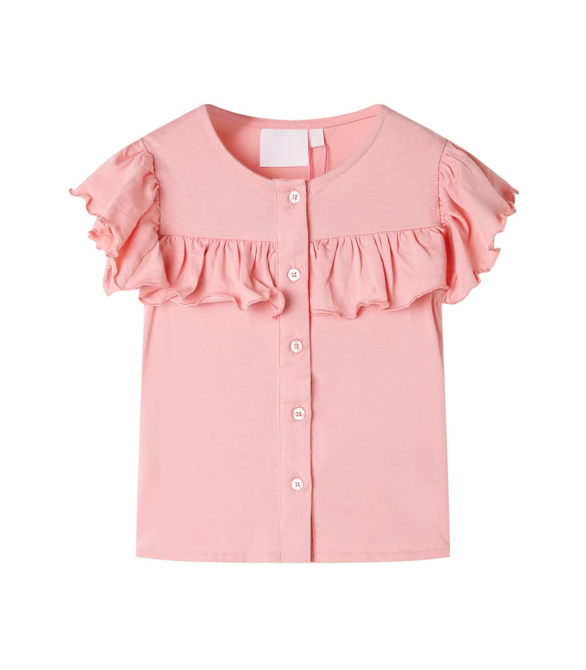Our children’s clothing line is all about affordable, high-quality, and durable everyday wear for kids aged 1.5 to 10. Our range includes jackets, sweaters, shirts, and many more, with a variety in style, size, and colour. Following the high-quality standard in the market, we are using high-grade materials and advanced manufacturing techniques. This kids' T-shirt has short sleeves, a round neckline, and closes with a row of buttons on the front. The children's T-shirt has nice ruffles on the shoulders and chest. The T-shirt for kids is made of cotton for a soft and comfortable touch. Good to know: This size chart in the picture provides measurements for kids aged 1.5 to 10, covering the height, chest, waist, and hip. You can easily find the right fit for your child.