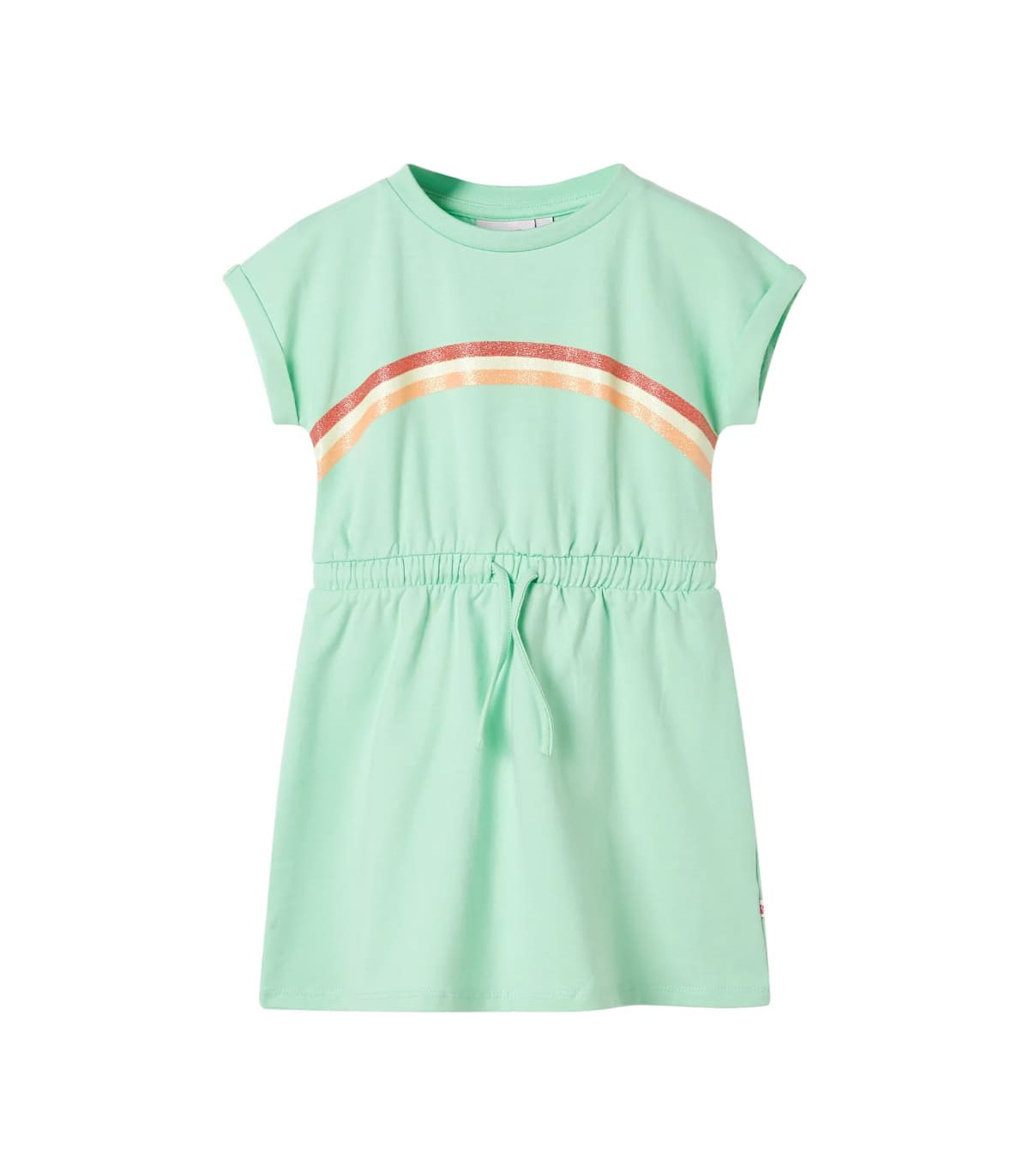 Our children's clothing line is all about affordable, high-quality, and durable everyday wear for kids aged 1.5 to 10. Our range includes jackets, sweaters, shirts, and many more, with a variety in style, size, and colour. Following the high-quality standard in the market, we are using high-grade materials and advanced manufacturing techniques. This kid's dress has a round neckline, cap sleeves, an elastic waistband with an adjustable drawstring. This children's dress features three colourful curved lines. The kids' short dress is made from soft material that includes 95% cotton and 5% elastane for comfort and breathability. Good to know: This size chart in the picture provides measurements for kids aged 1.5 to 10, covering the height, chest, waist, and hip. You can easily find the right fit for your child.