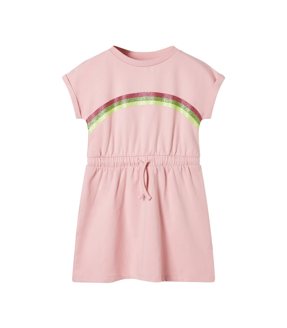 Our children's clothing line is all about affordable, high-quality, and durable everyday wear for kids aged 1.5 to 10. Our range includes jackets, sweaters, shirts, and many more, with a variety in style, size, and colour. Following the high-quality standard in the market, we are using high-grade materials and advanced manufacturing techniques. This kid's dress has a round neckline, cap sleeves, an elastic waistband with an adjustable drawstring. This children's dress features three colourful curved lines. The kids' short dress is made from soft material that includes 95% cotton and 5% elastane for comfort and breathability. Good to know: This size chart in the picture provides measurements for kids aged 1.5 to 10, covering the height, chest, waist, and hip. You can easily find the right fit for your child.