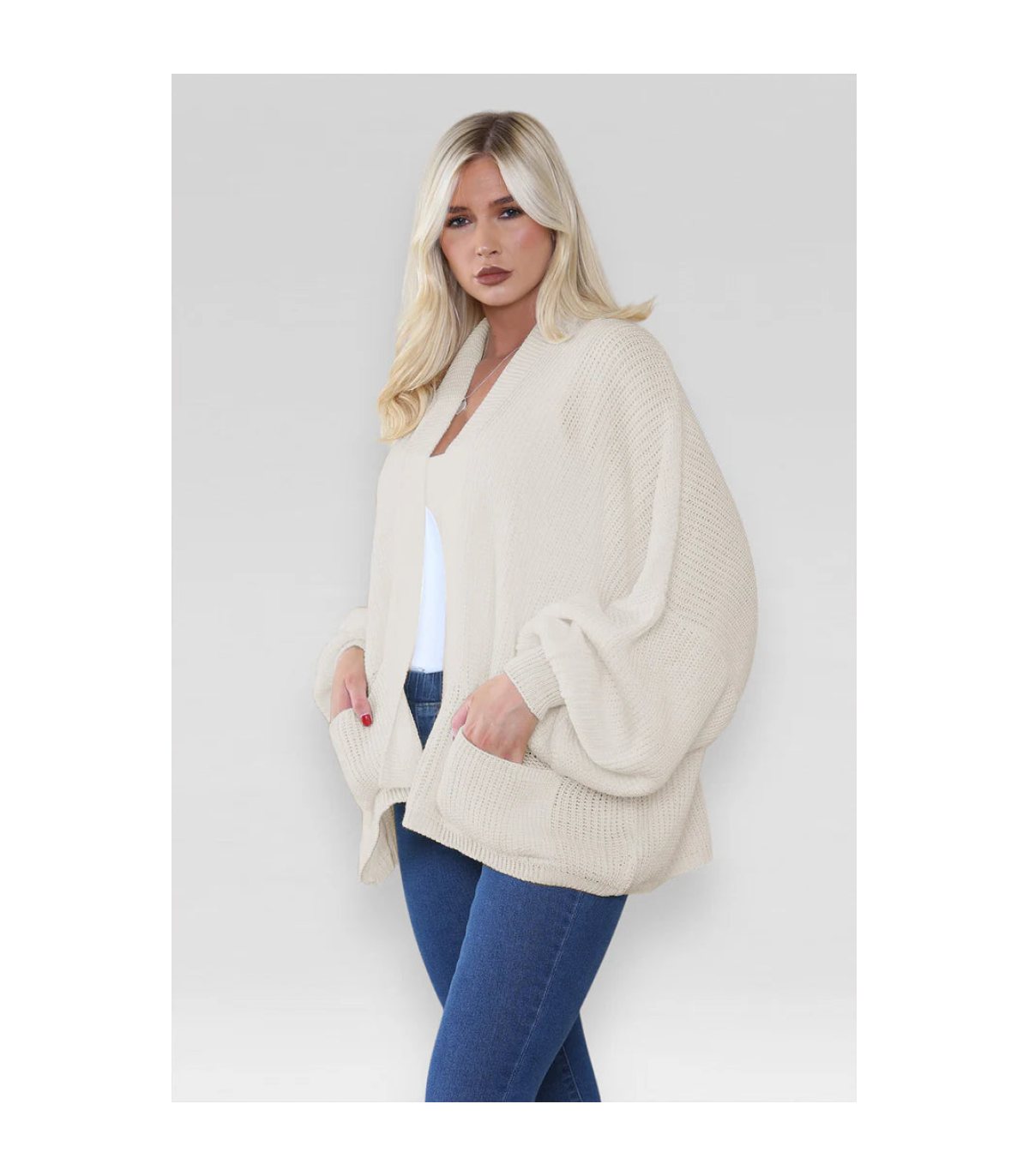 Stay cozy and stylish with our Ladies Oversized Cropped Short Balloon Pocket Chunky Knitted Cardigan. The chunky knit and balloon pockets provide both warmth and a trendy look. Perfect for layering, this cardigan is a must-have for any fashion-forward wardrobe.
