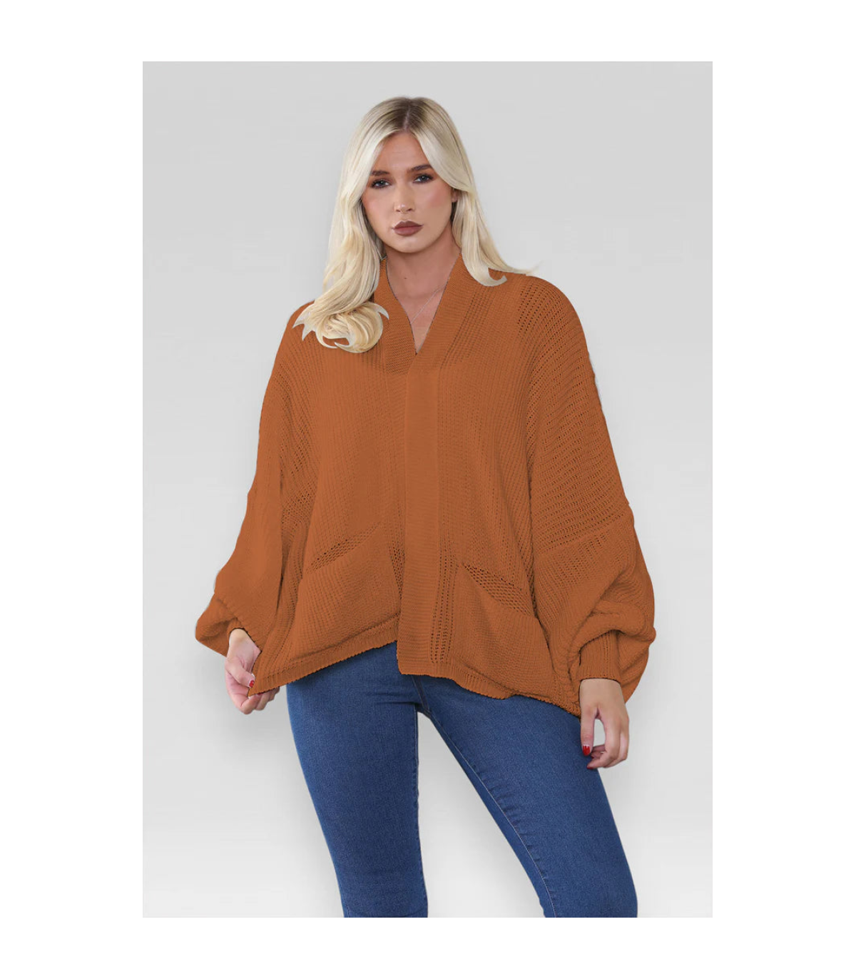 Stay cozy and stylish with our Ladies Oversized Cropped Short Balloon Pocket Chunky Knitted Cardigan. The chunky knit and balloon pockets provide both warmth and a trendy look. Perfect for layering, this cardigan is a must-have for any fashion-forward wardrobe.