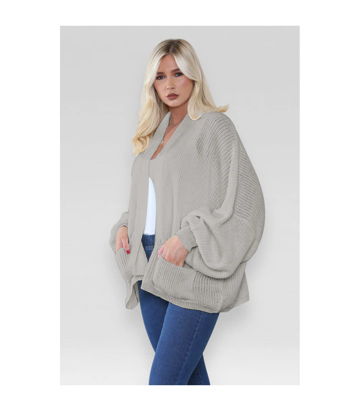Stay cozy and stylish with our Ladies Oversized Cropped Short Balloon Pocket Chunky Knitted Cardigan. The chunky knit and balloon pockets provide both warmth and a trendy look. Perfect for layering, this cardigan is a must-have for any fashion-forward wardrobe.