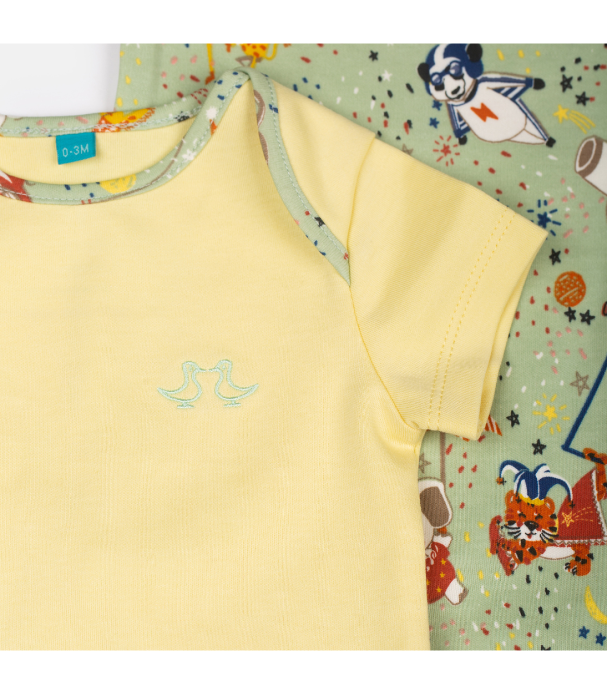 The vests also have an envelope neck which is ideal for easy dressing. Both are finished with our embroidered logo, with each pack containing one elephant printed vest and one plain, colourful one with contrast trim.