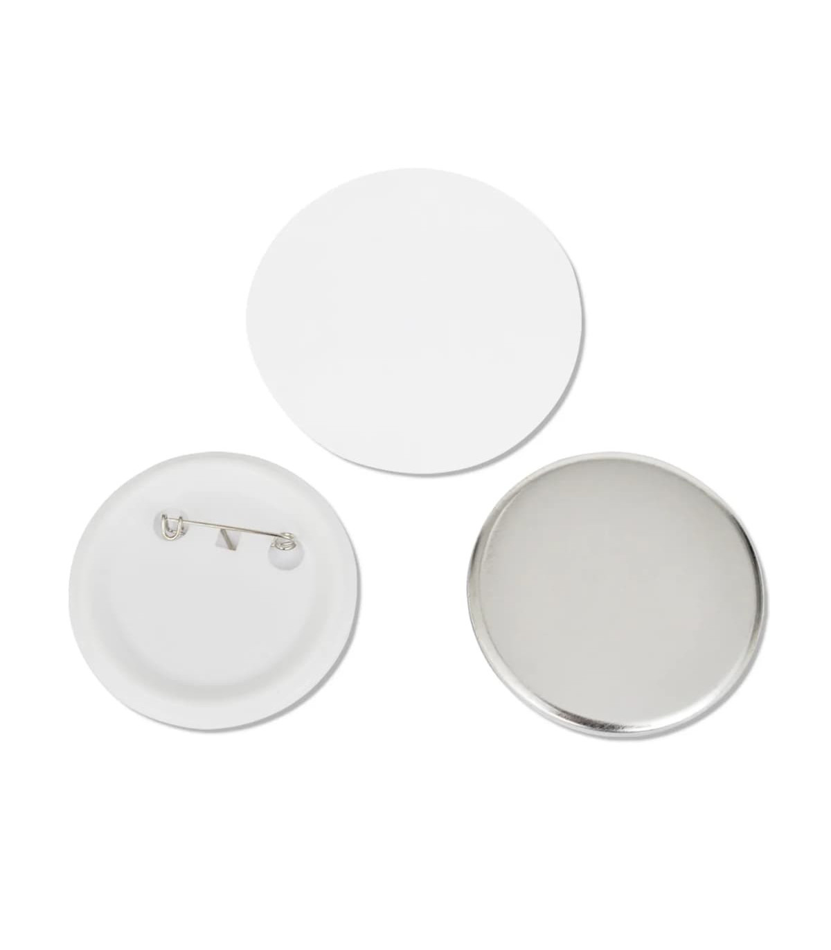 Use our button parts to make your own DIY pinback badges. With your company or event logo on them, they can be used for advertising and promotional campaigns. The plastic back makes it light and easy to pin on. Delivery includes 500 sets. Note: For use with the 58 mm button press, which is also available in our shop (sku 30055).