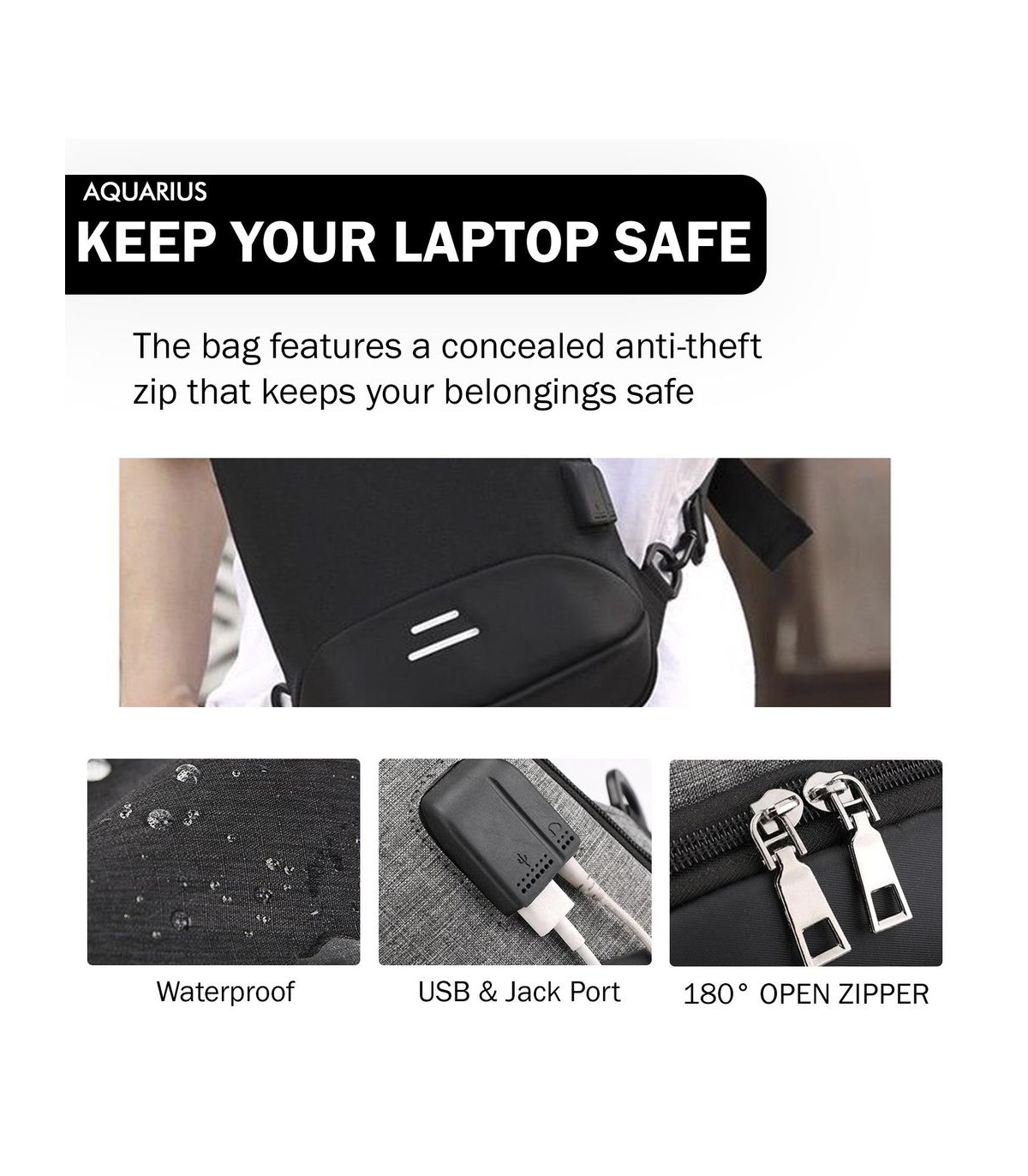 Aquarius Waterproof Anti-Theft Backpack with USB Charging Port Unisex Small Bag Whether you’re looking for a great laptop bag for work or you need a lunch bag for school, an anti-theft bag is a great choice. The concealed zip keeps all of your belongings safely out of reach of would-be thieves, and the included USB charging port makes it super simple to charge up your phone, laptop, tablet, or any other device while on the go. All you need to do is slot a power bank (not included) into the bag and connect it to the port. Made from rugged canvas that wears well while staying super breathable, with reflective bands to keep you safe while crossing the street at night, your bag always has your back no matter where you’re going. There are six different internal storage pockets, making it easy to keep things organized too. Whether you’re travelling ANTI-THEFT: Keep your belongings safe and secure while travelling with the Aquarius Anti-Theft Backpack. It comes equipped with 3 anti-theft compartments. The main section at the front comes with a TSA lock, ensuring that no one has access to your backpack apart from you. The main body of the backpack has fully hidden zips beneath the fabric making it secure from pickpocketers and the internal security belt helps prevent items like a laptop or iPad from moving and getting damaged. Lastly there ORGANISED AND SECURE: Equipped with a variety of functional pockets and sleeves, the Aquarius Anti-Theft Backpack has a deceivingly large capacity. It is ideal for storing laptops, tablets, books, phones, power banks, wallets, pens and pencils, keys, and much more. Features: Anti-theft zip opening Reflective bands Good breathability and 2cm elasticity on the back Shoulder strap with S-shaped ergonomic design USB charging port Six inside pockets Internal material: polyester. Box Contains: Aquarius Small AntiTheft Backpack with USB Charging Port (Select Your Colour From Dropdown)
