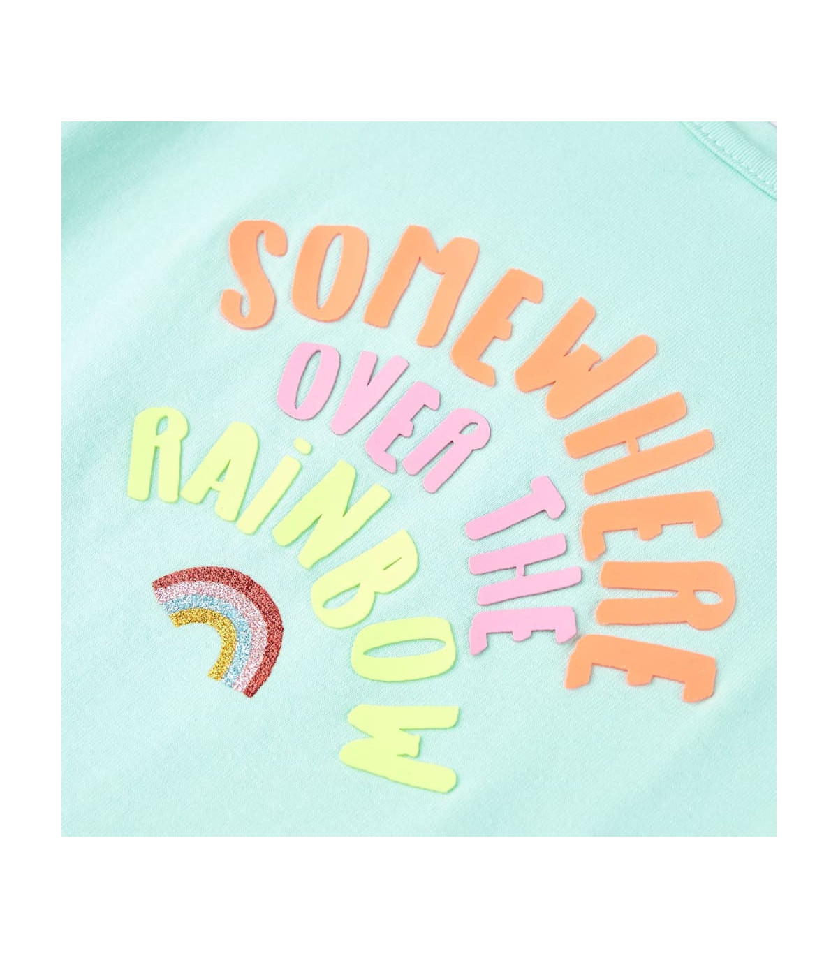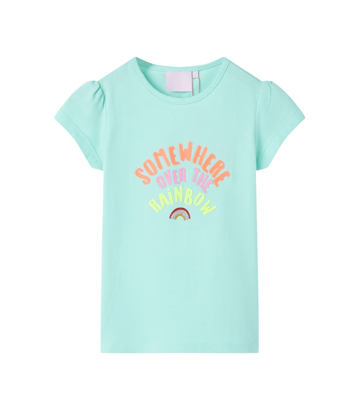 Our children’s clothing line is all about affordable, high-quality, and durable everyday wear for kids aged 1.5 to 10. Our range includes jackets, sweaters, shirts, and many more, with a variety in style, size, and colour. Following the high-quality standard in the market, we are using high-grade materials and advanced manufacturing techniques. This kids' T-shirt has short sleeves, a round neckline, and a straight model. The children's T-shirt features a rainbow and the words “somewhere over the rainbow”. The T-shirt for kids is made of cotton and elastane for a soft and comfortable touch. Good to know: This size chart in the picture provides measurements for kids aged 1.5 to 10, covering the height, chest, waist, and hip. You can easily find the right fit for your child.