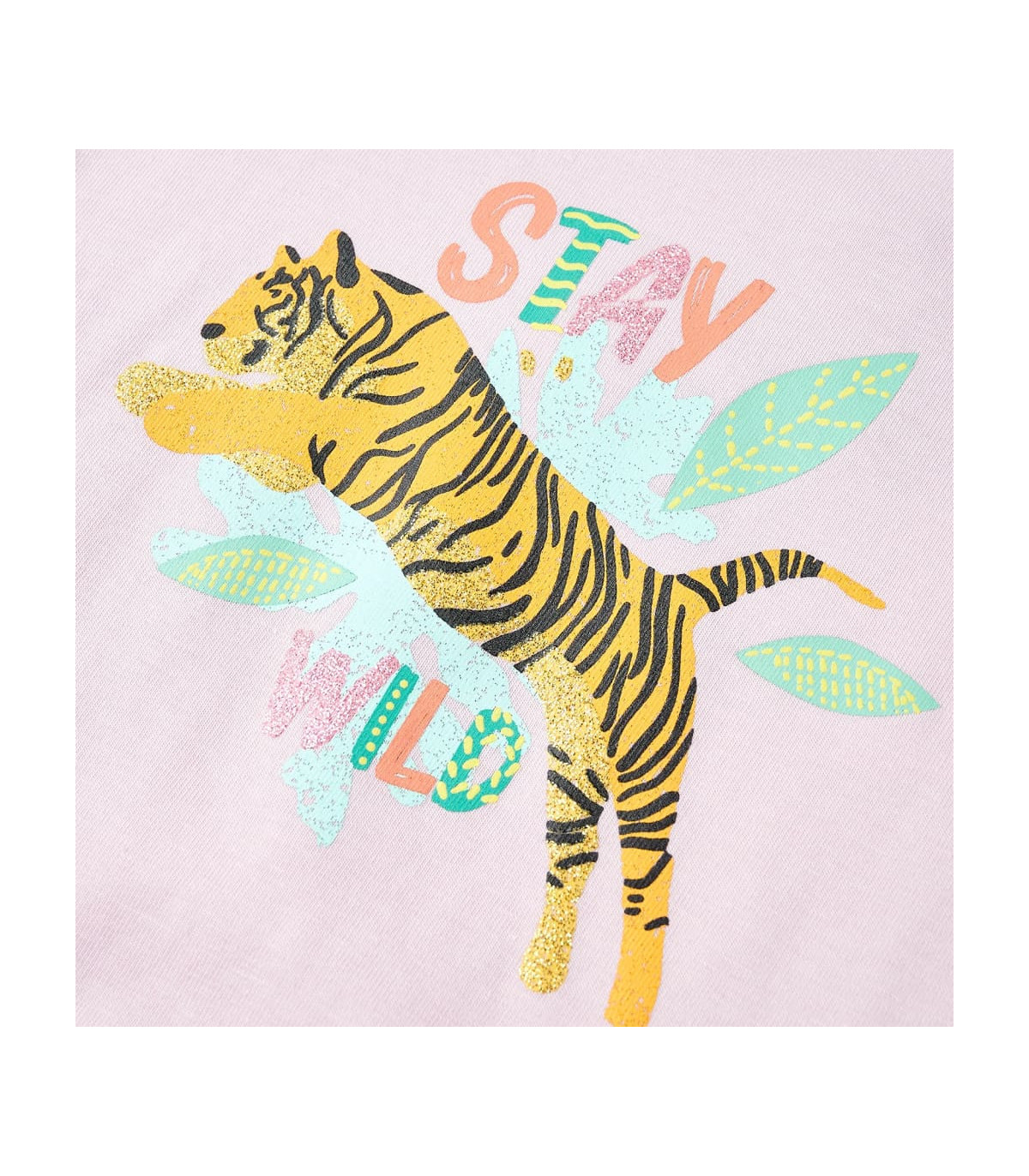 Our children’s clothing line is all about affordable, high-quality, and durable everyday wear for kids aged 1.5 to 10. Our range includes jackets, sweaters, shirts, and many more, with a variety in style, size, and colour. Following the high-quality standard in the market, we are using high-grade materials and advanced manufacturing techniques. This kids' T-shirt has short sleeves, a round neckline, and a straight model. The children's T-shirt features a tiger and the words “stay wild”. The T-shirt for kids is made of cotton and elastane for a soft and comfortable touch. Good to know: This size chart in the picture provides measurements for kids aged 1.5 to 10, covering the height, chest, waist, and hip. You can easily find the right fit for your child.