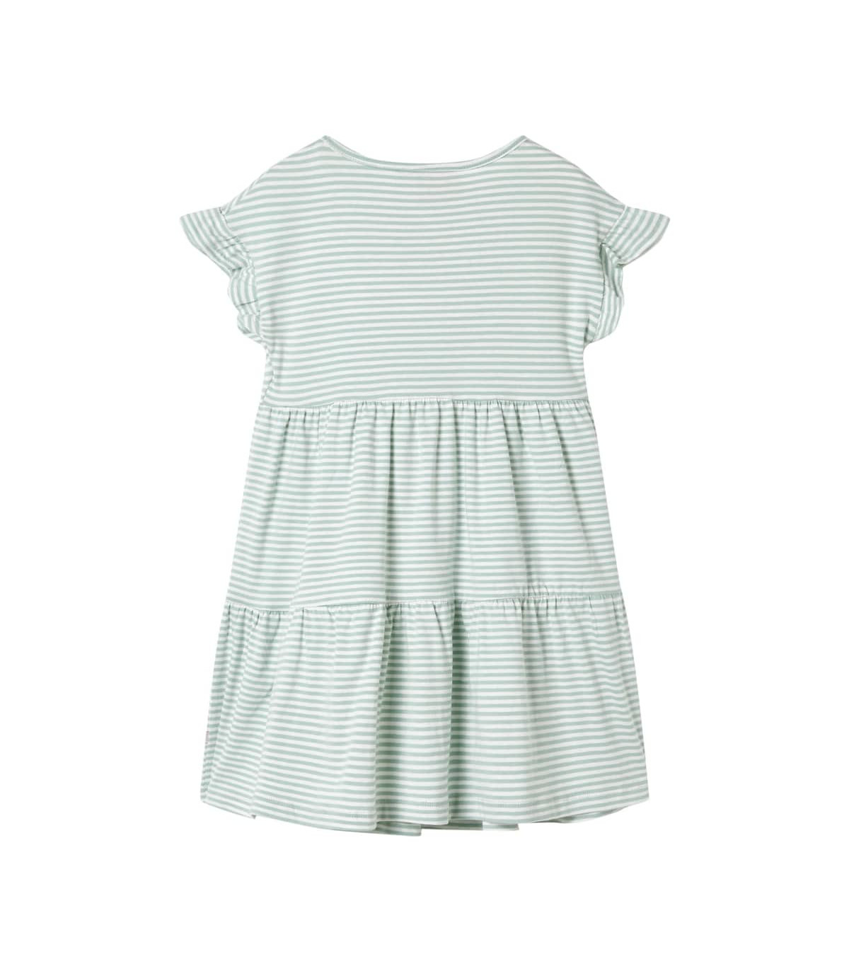 Our children's clothing line is all about affordable, high-quality, and durable everyday wear for kids aged 1.5 to 10. Our range includes jackets, sweaters, shirts, and many more, with a variety in style, size, and colour. Following the high-quality standard in the market, we are using high-grade materials and advanced manufacturing techniques. This kids' dress has a round neckline, ruffled sleeves, and a pocket on the chest. This mint children's dress features stripes all over. The kids' short dress is made from soft material that includes cotton and elastane for comfort and breathability. Good to know: This size chart in the picture provides measurements for kids aged 1.5 to 10, covering the height, chest, waist, and hip. You can easily find the right fit for your child.