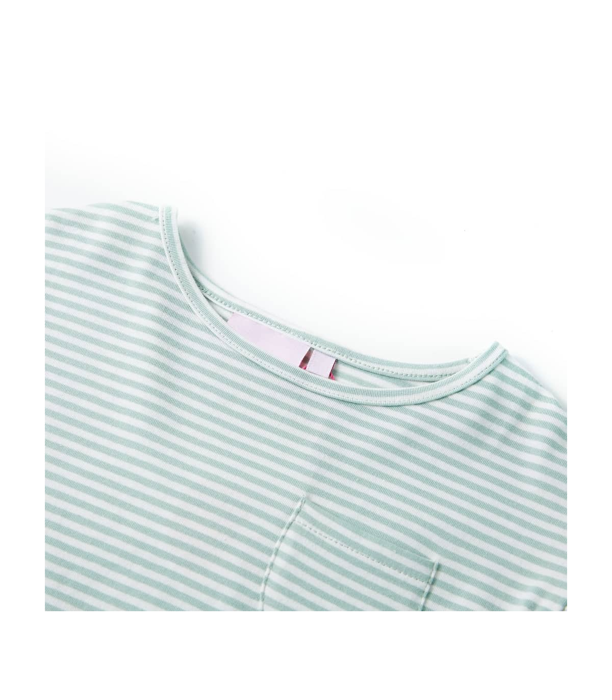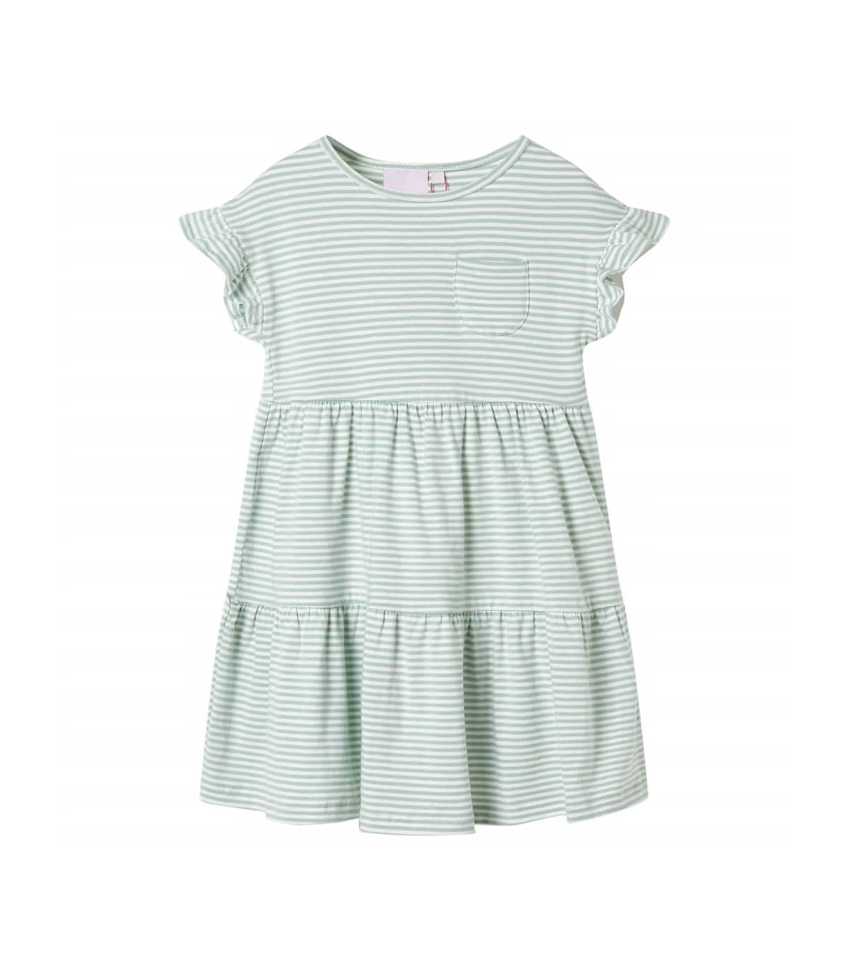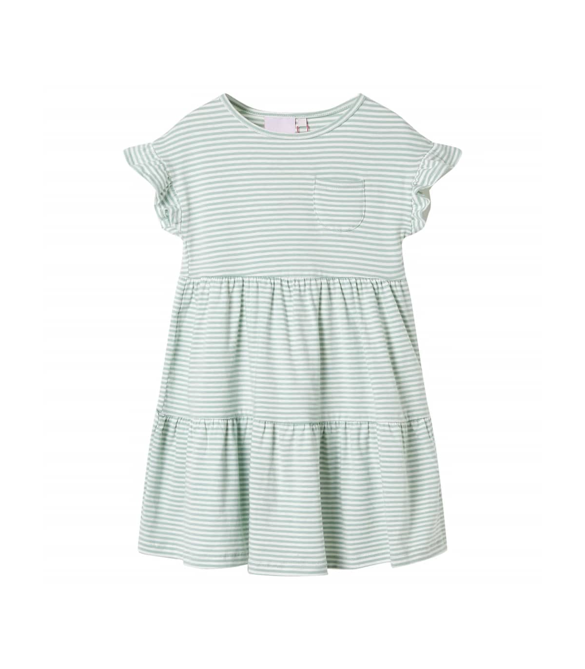 Our children's clothing line is all about affordable, high-quality, and durable everyday wear for kids aged 1.5 to 10. Our range includes jackets, sweaters, shirts, and many more, with a variety in style, size, and colour. Following the high-quality standard in the market, we are using high-grade materials and advanced manufacturing techniques. This kids' dress has a round neckline, ruffled sleeves, and a pocket on the chest. This mint children's dress features stripes all over. The kids' short dress is made from soft material that includes cotton and elastane for comfort and breathability. Good to know: This size chart in the picture provides measurements for kids aged 1.5 to 10, covering the height, chest, waist, and hip. You can easily find the right fit for your child.