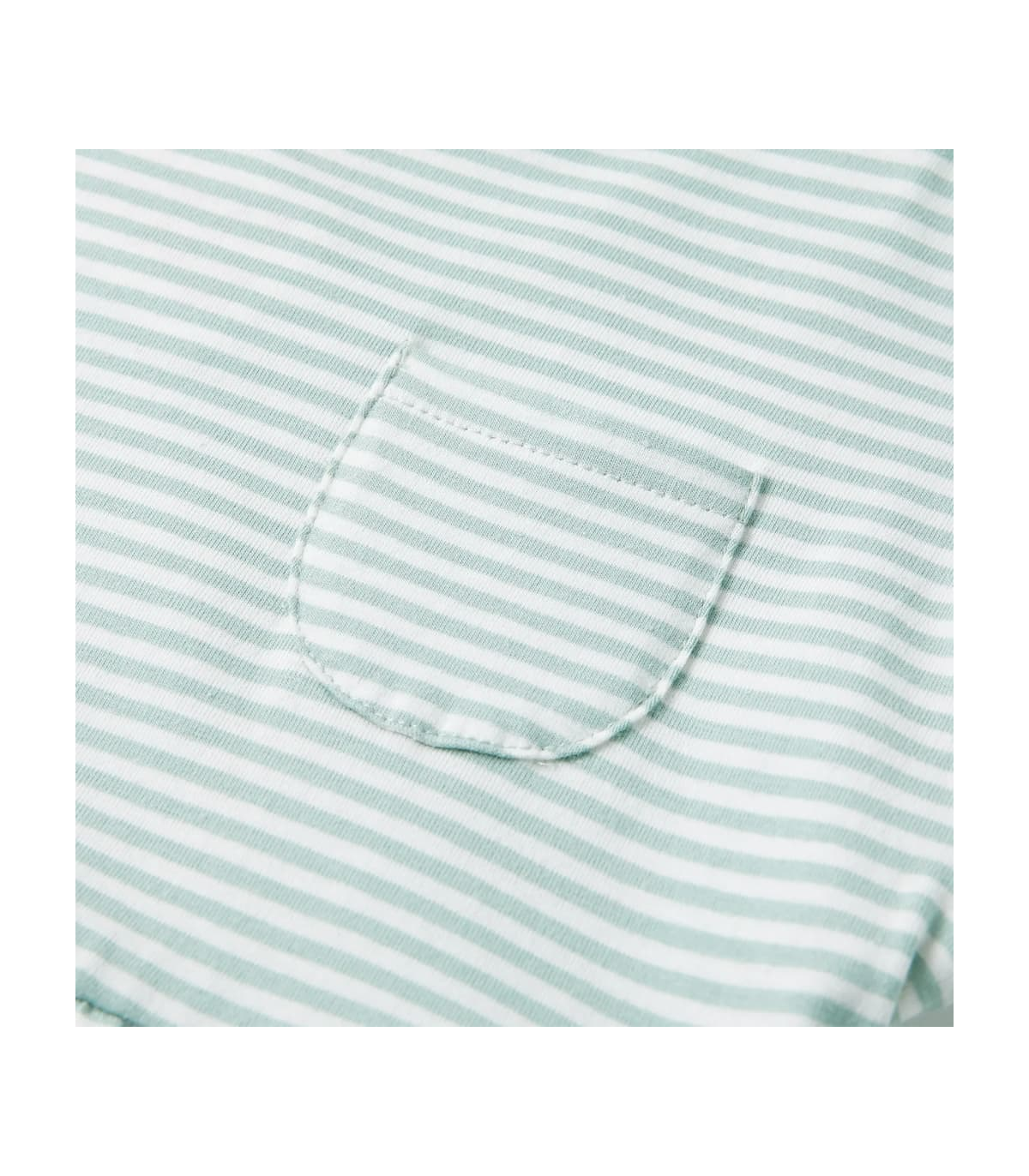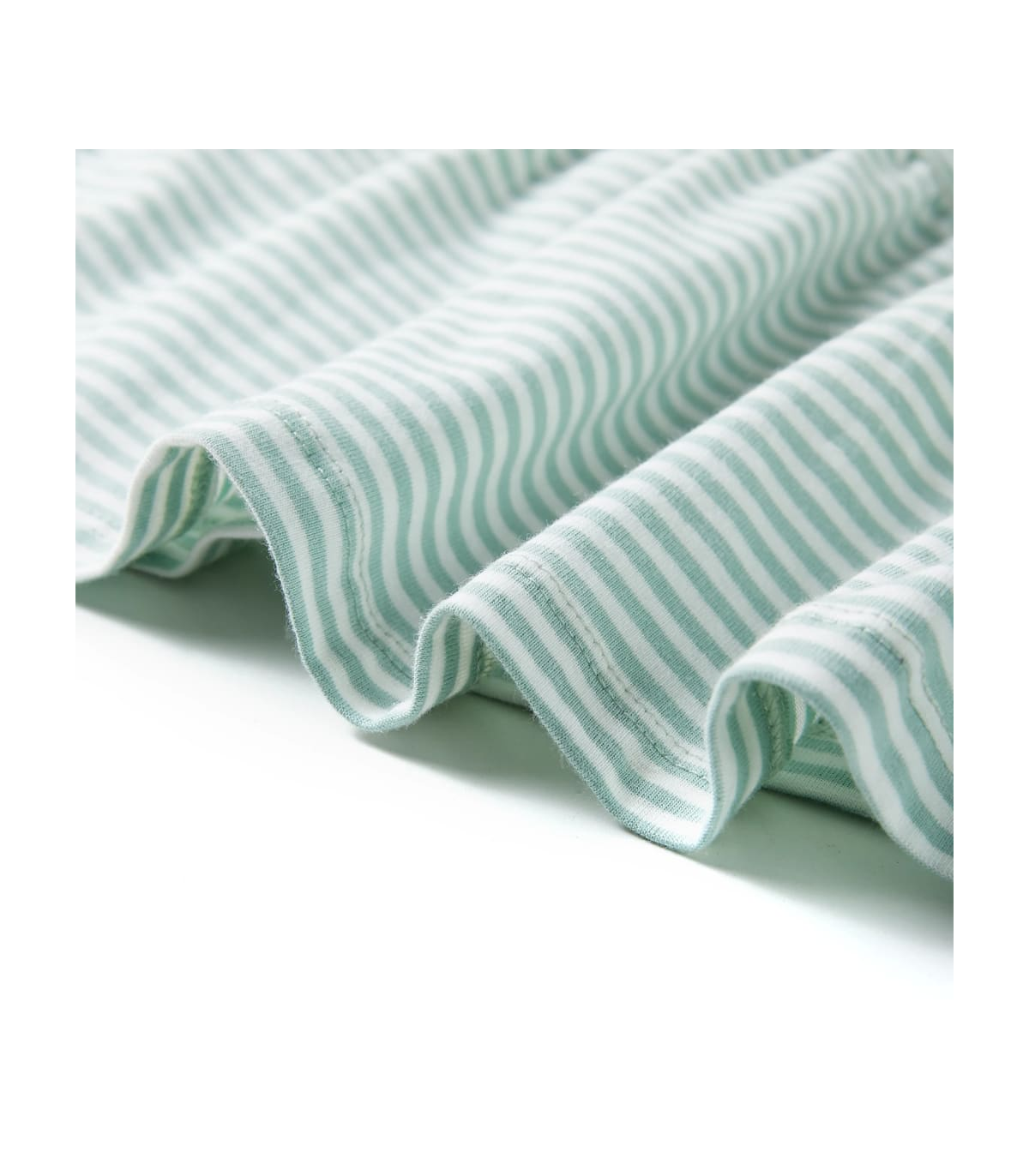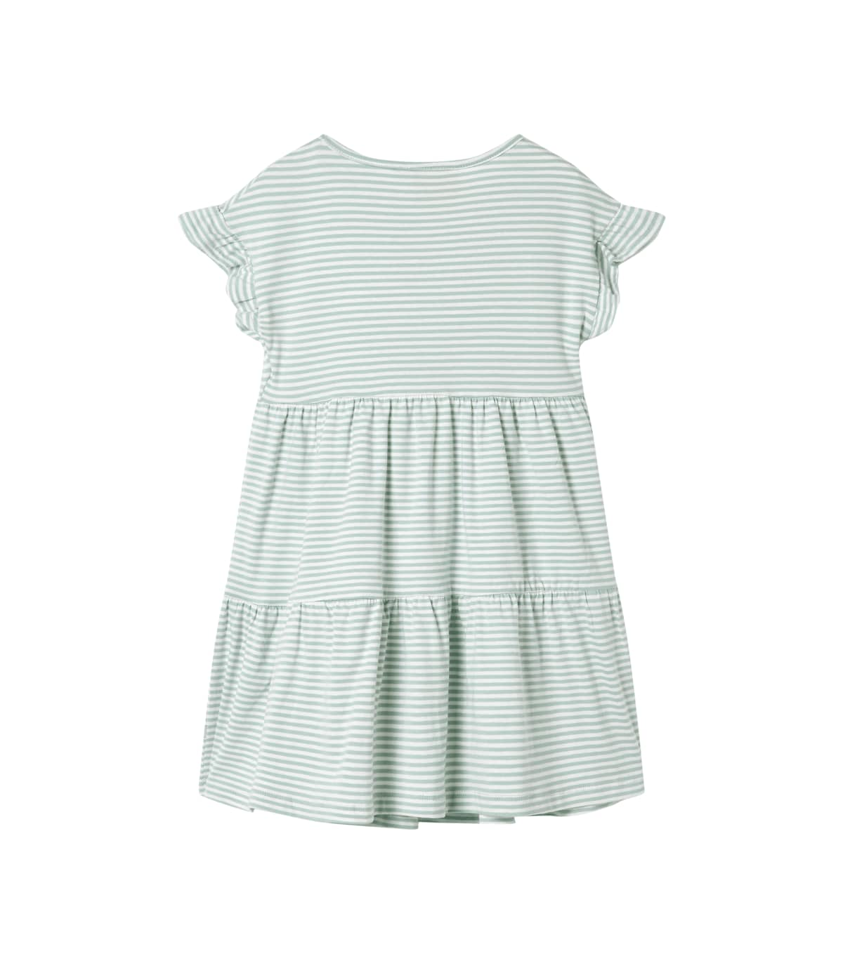 Our children's clothing line is all about affordable, high-quality, and durable everyday wear for kids aged 1.5 to 10. Our range includes jackets, sweaters, shirts, and many more, with a variety in style, size, and colour. Following the high-quality standard in the market, we are using high-grade materials and advanced manufacturing techniques. This kids' dress has a round neckline, ruffled sleeves, and a pocket on the chest. This mint children's dress features stripes all over. The kids' short dress is made from soft material that includes cotton and elastane for comfort and breathability. Good to know: This size chart in the picture provides measurements for kids aged 1.5 to 10, covering the height, chest, waist, and hip. You can easily find the right fit for your child.