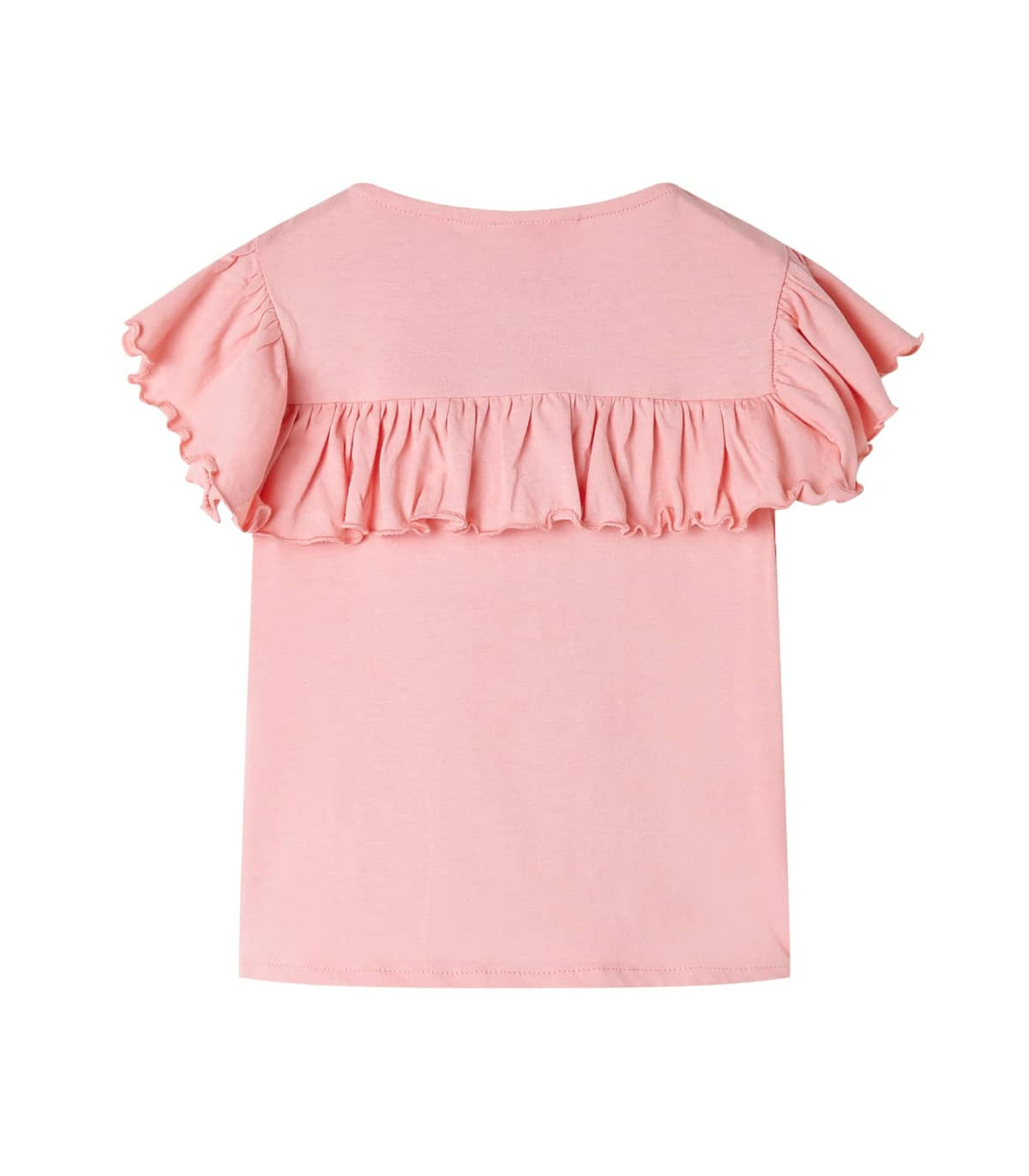 Our children’s clothing line is all about affordable, high-quality, and durable everyday wear for kids aged 1.5 to 10. Our range includes jackets, sweaters, shirts, and many more, with a variety in style, size, and colour. Following the high-quality standard in the market, we are using high-grade materials and advanced manufacturing techniques. This kids' T-shirt has short sleeves, a round neckline, and closes with a row of buttons on the front. The children's T-shirt has nice ruffles on the shoulders and chest. The T-shirt for kids is made of cotton for a soft and comfortable touch. Good to know: This size chart in the picture provides measurements for kids aged 1.5 to 10, covering the height, chest, waist, and hip. You can easily find the right fit for your child.