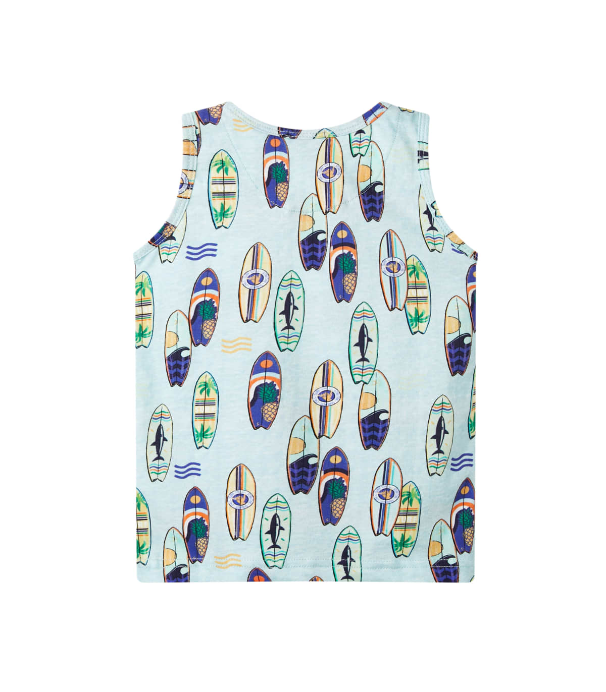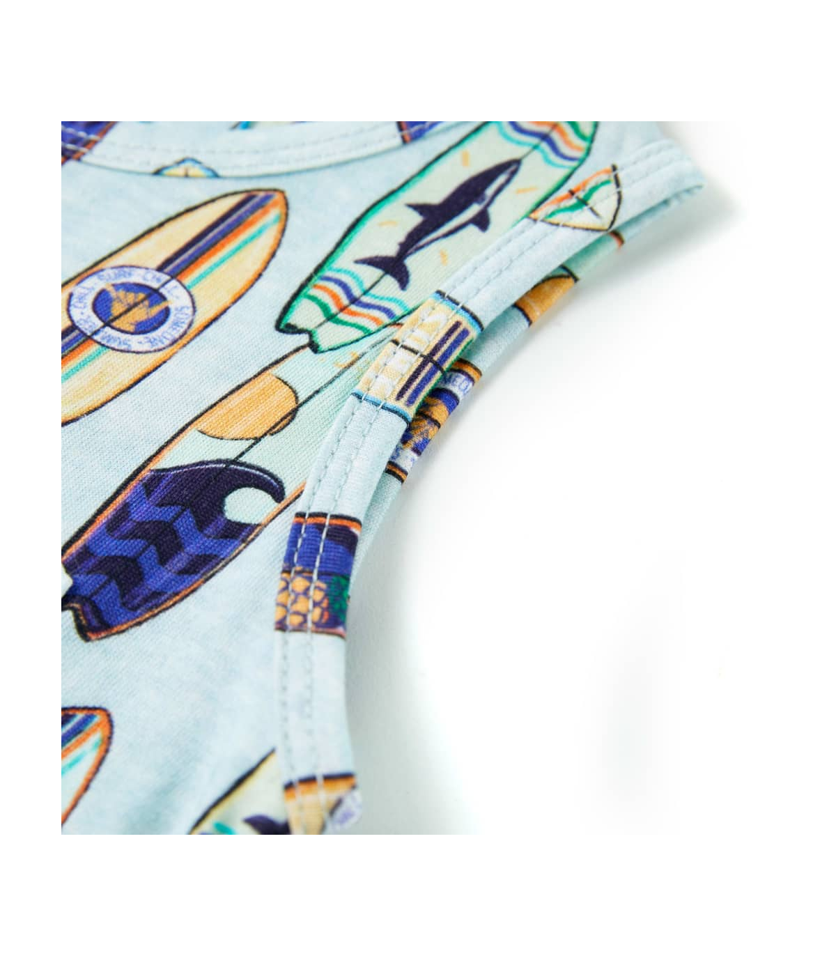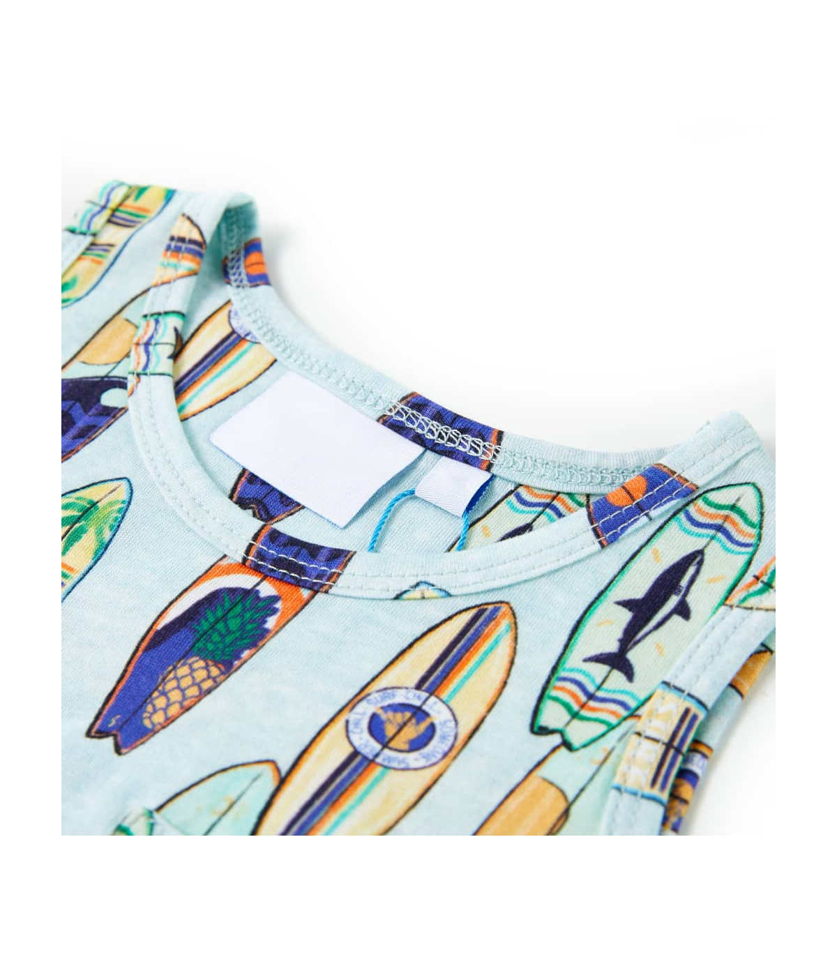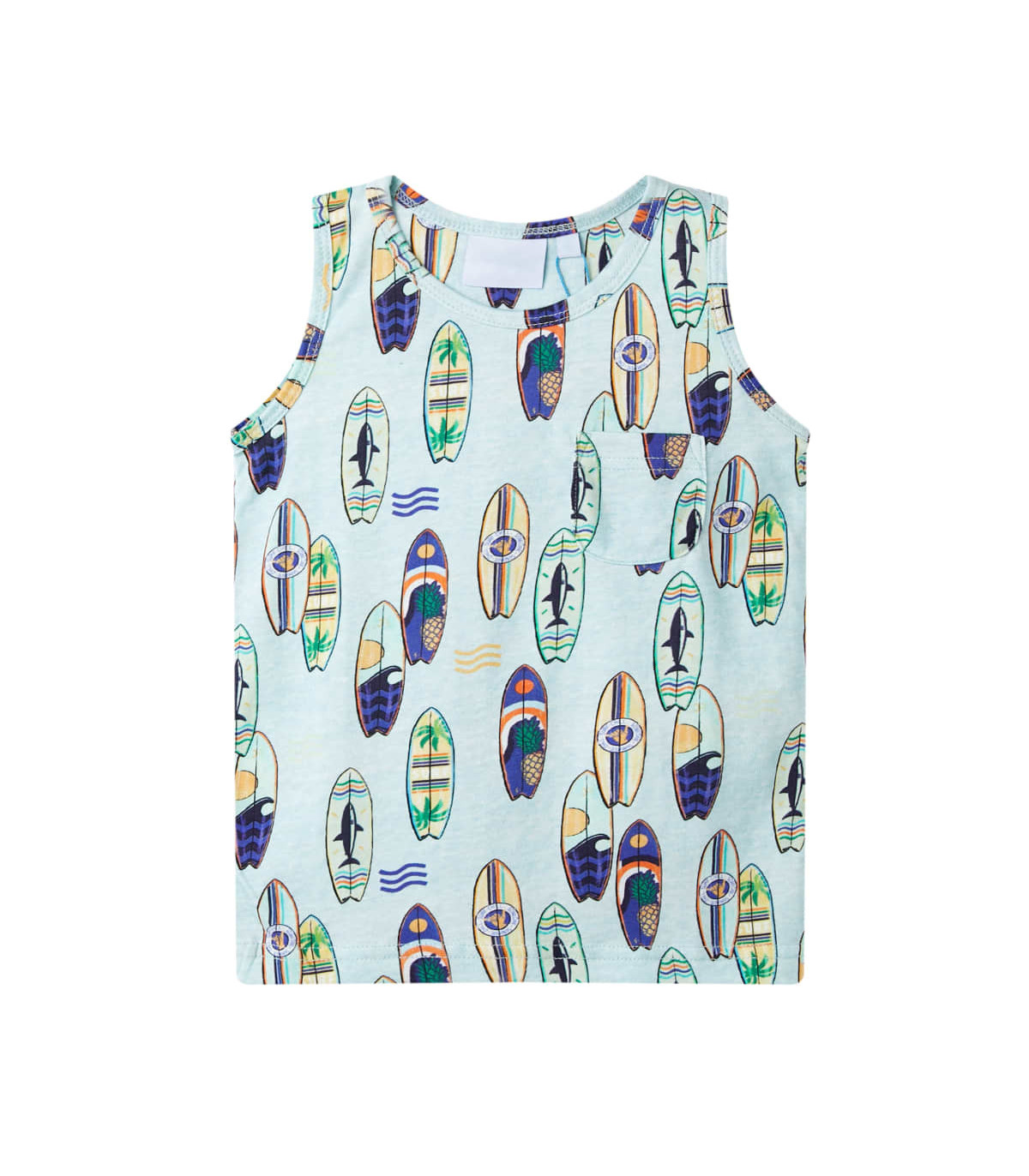 Our children's clothing line is all about affordable, high-quality, and durable everyday wear for kids aged 1.5 to 10. Our range includes jackets, sweaters, shirts, and many more, with a variety in style, size, and colour. Following the high-quality standard in the market, we are using high-grade materials and advanced manufacturing techniques. The tank top features colourful surfboard all over, which adds extra fun. This kids' tank top has a straight fit. The tank top for kids is made of 100% cotton for a soft and comfortable touch. Good to know: This size chart in the picture provides measurements for kids aged 1.5 to 10, covering the height, chest, waist, and hip. You can easily find the right fit for your child.