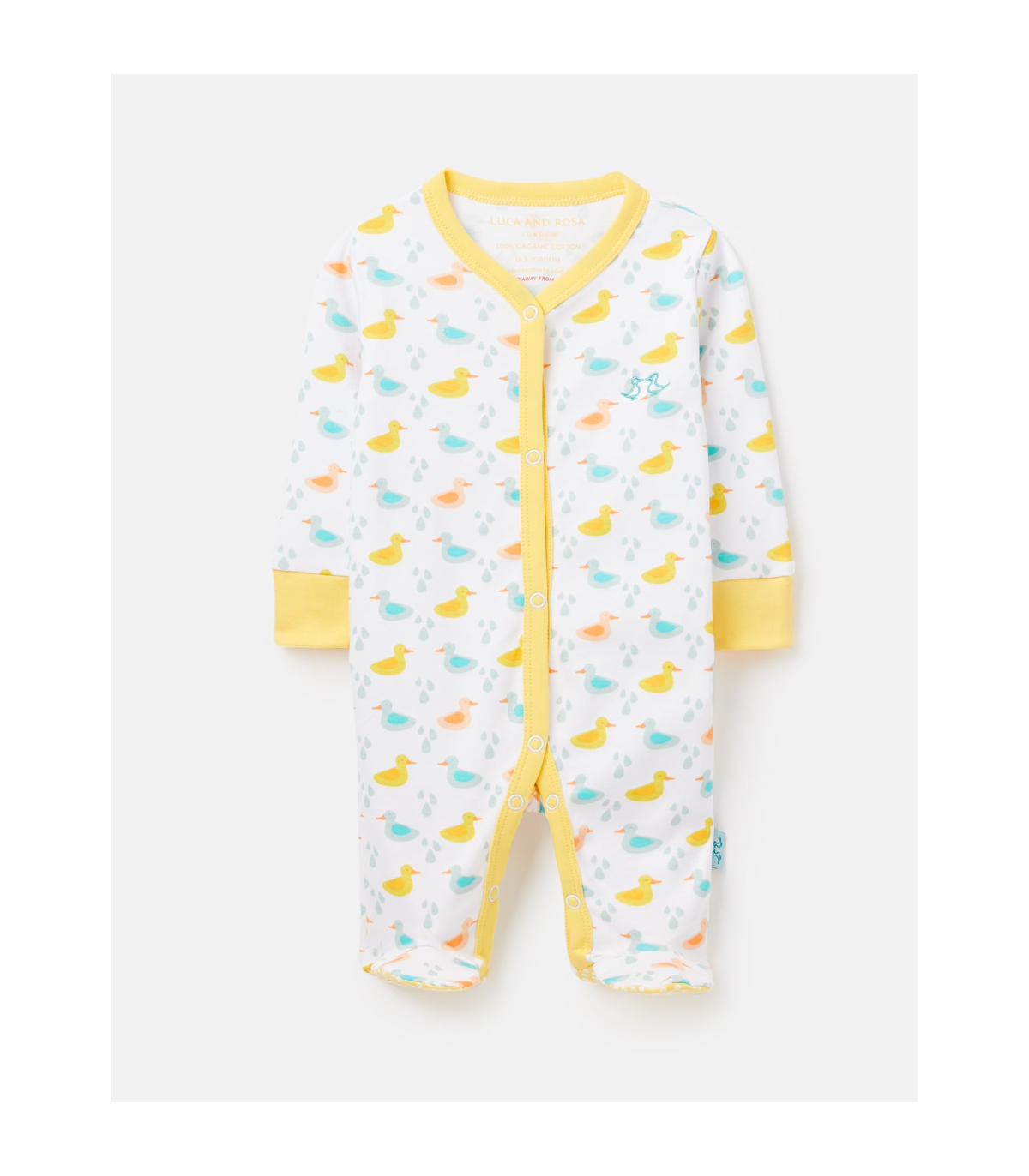 Dress your little treasure in Luca and Rosa London’s luxury baby pyjamas. Our little ducks sleepsuit, which is tenderly crafted from 100% organic cotton, features a multi-popper front opening and contrast colour cuffs. It’s finished with our embroidered logo and playful duck print for that super cute look.