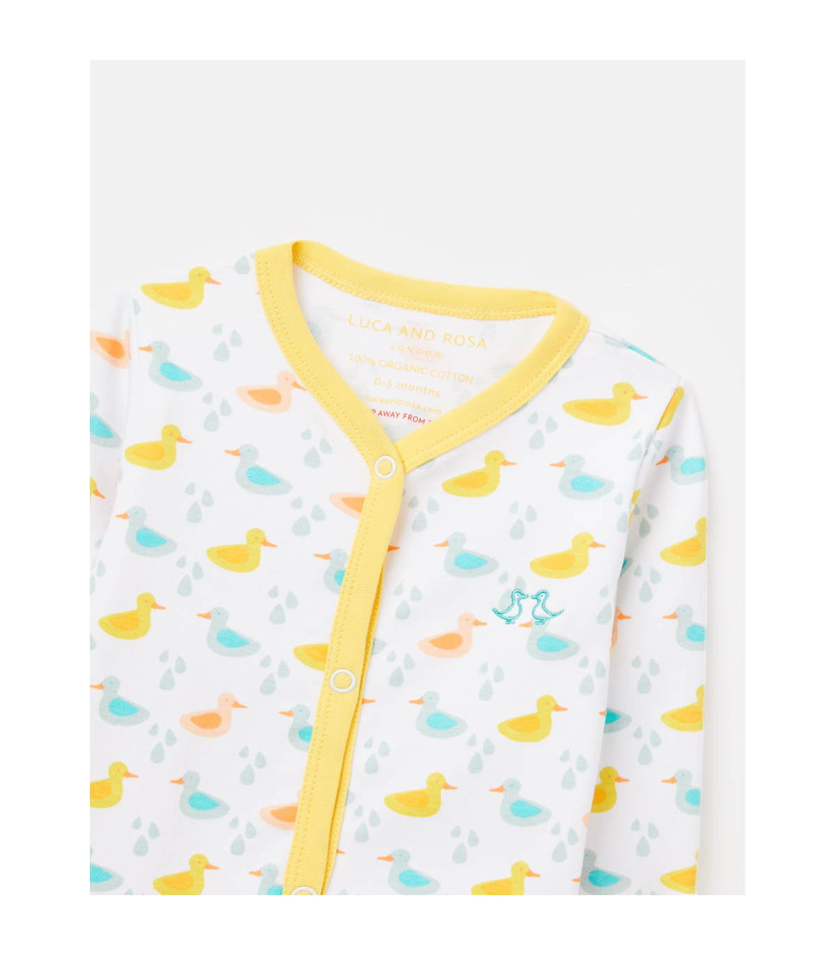 Dress your little treasure in Luca and Rosa London’s luxury baby pyjamas. Our little ducks sleepsuit, which is tenderly crafted from 100% organic cotton, features a multi-popper front opening and contrast colour cuffs. It’s finished with our embroidered logo and playful duck print for that super cute look.