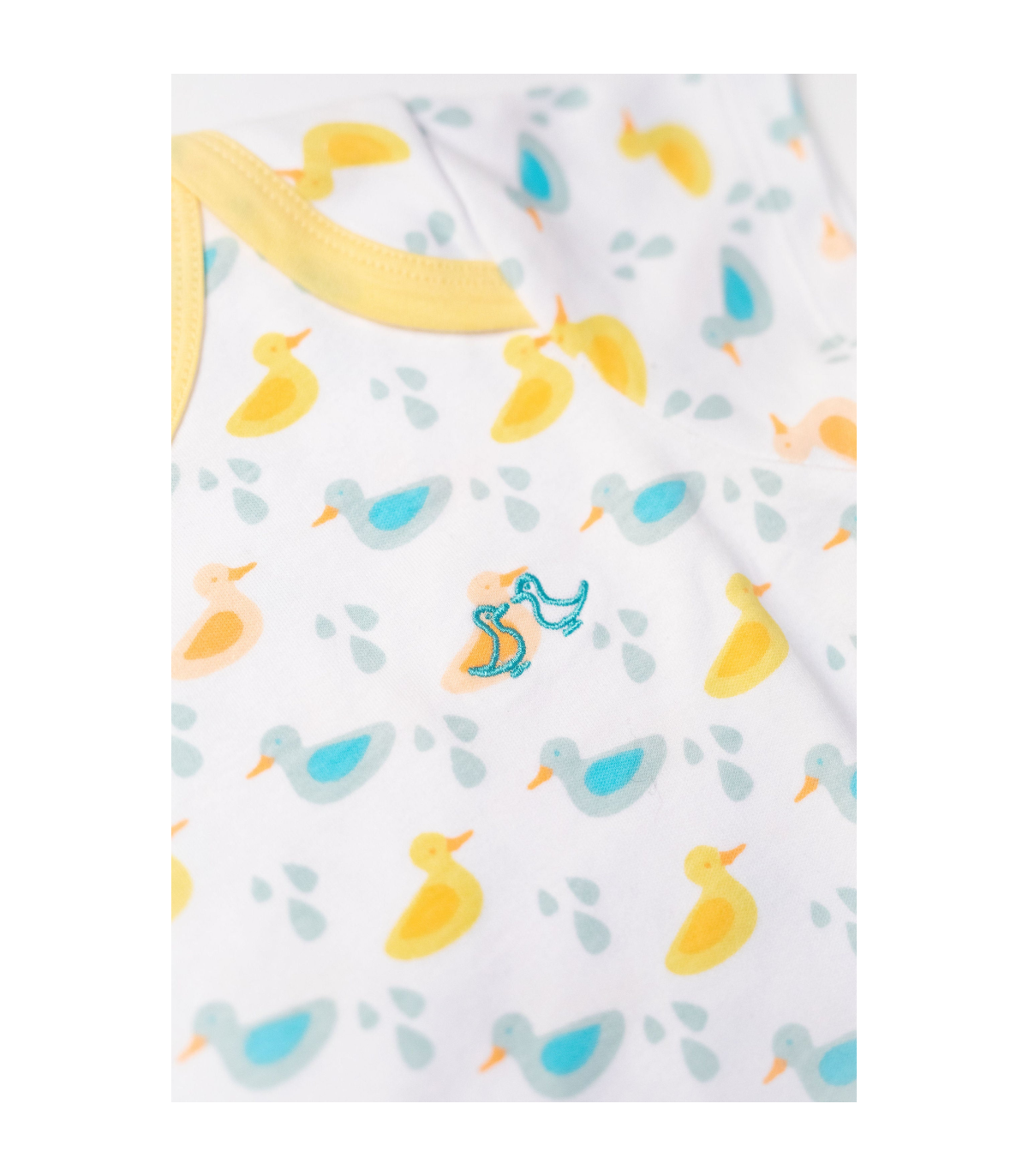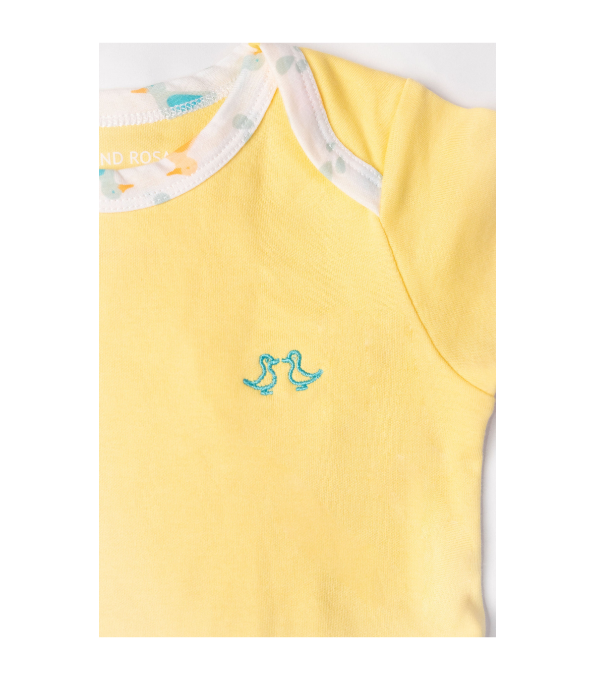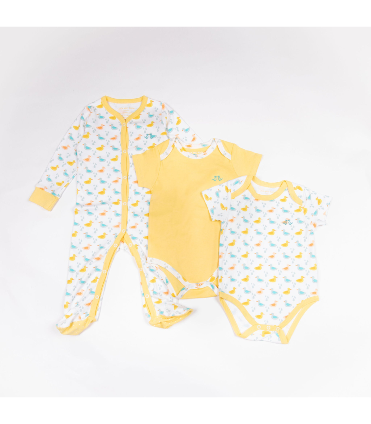 Designed for babies and toddlers from newborn up to 18-24 months, this luxurious set includes a sleep suit and two vests. The sleep suit features a front popper opening and contrast coloured trims. All are complemented by our distinctive embroidered logo and the stylish unisex duck print for that super cute look.