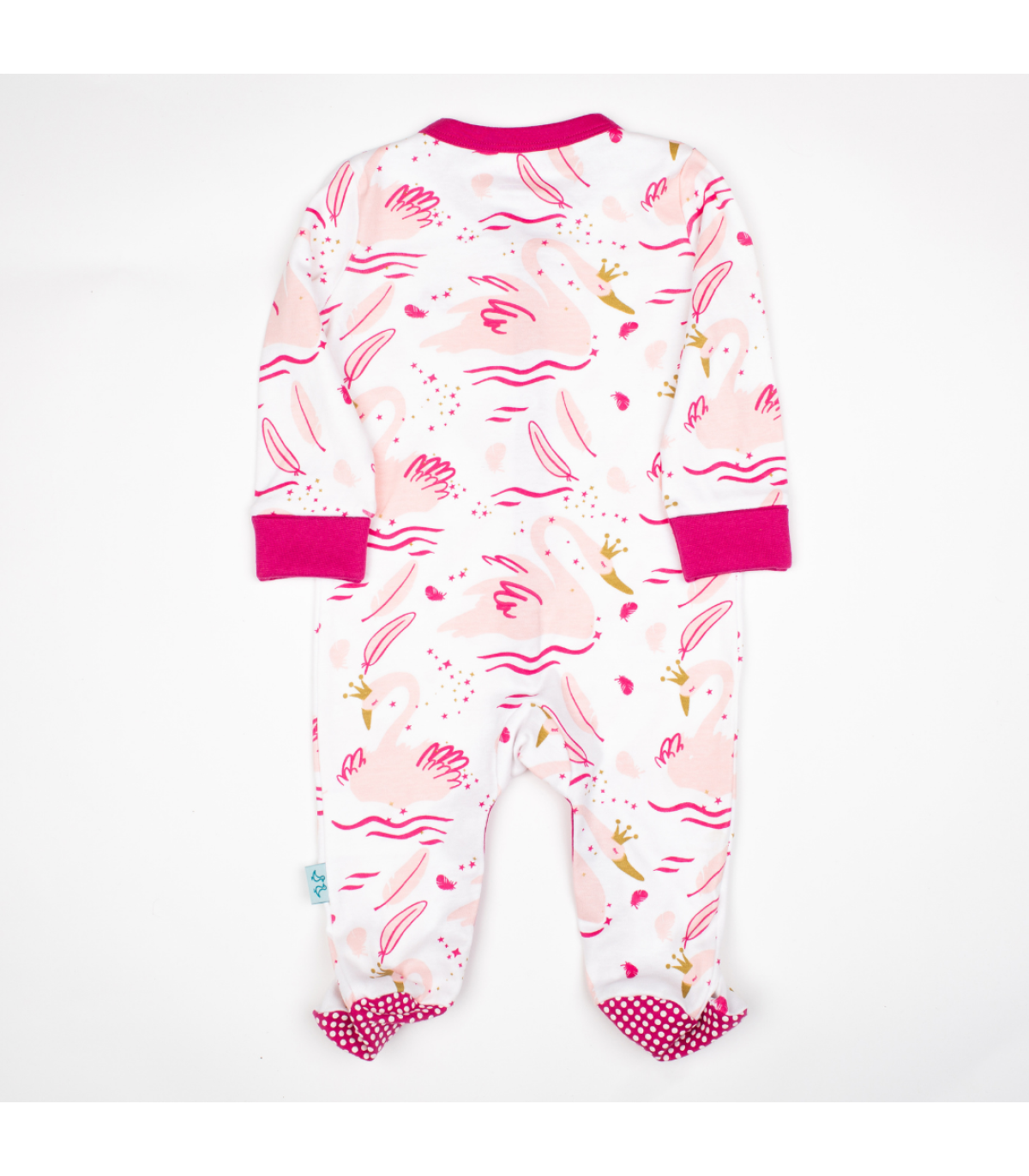 Dress your little treasure in Luca and Rosa London’s luxury baby pyjamas. Our swan princess baby grow, which is tenderly crafted from our beautiful cotton blend, features a multi-popper front opening and contrast colour cuffs. It’s finished with our embroidered logo and playful swan print for that super cute look.