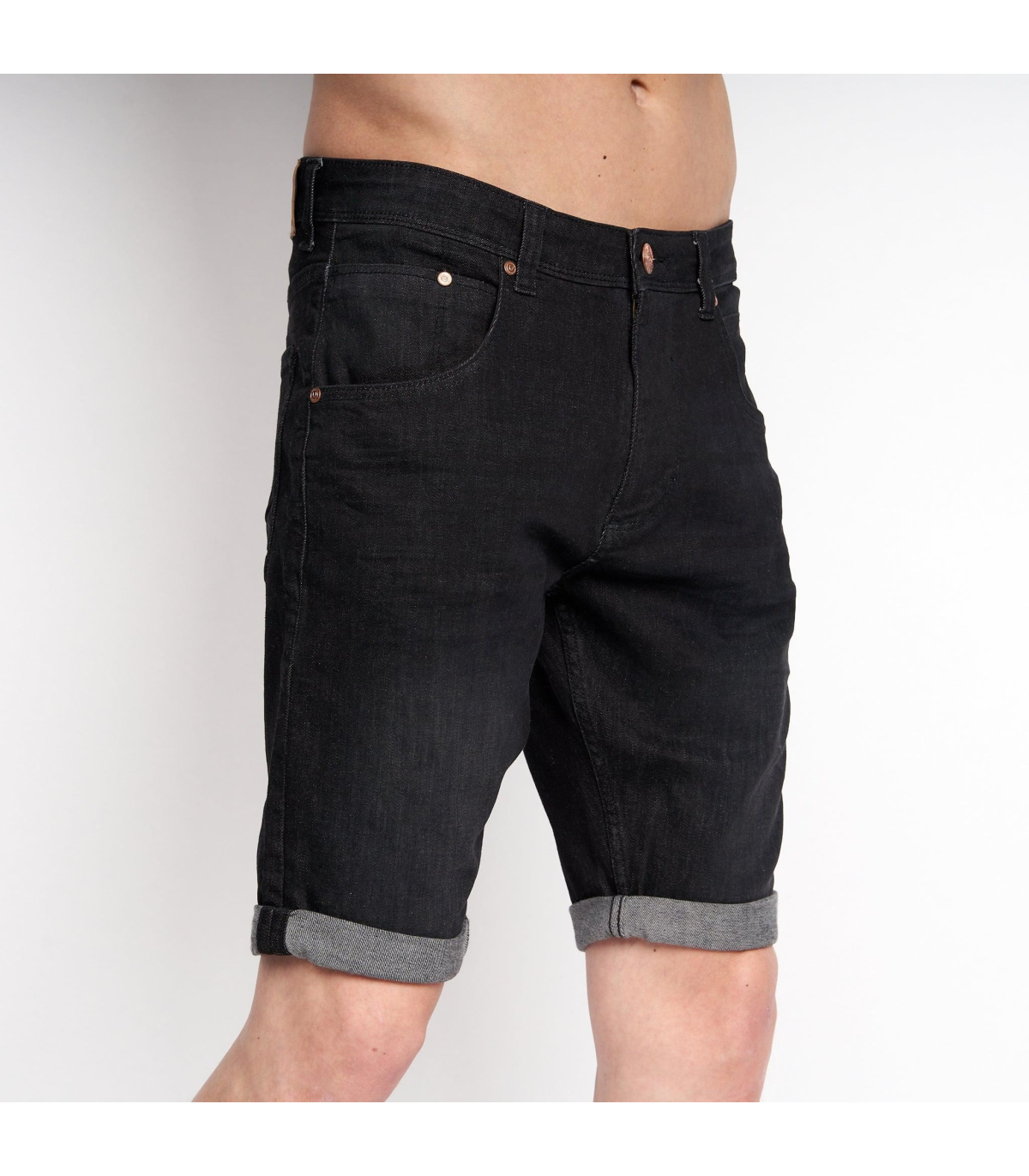Men's denim short with side pocket mouths, zip fly fastening, sewn in penny pocket feature, brand embossed buttons & rivets and denim embossing to back patch pocket.