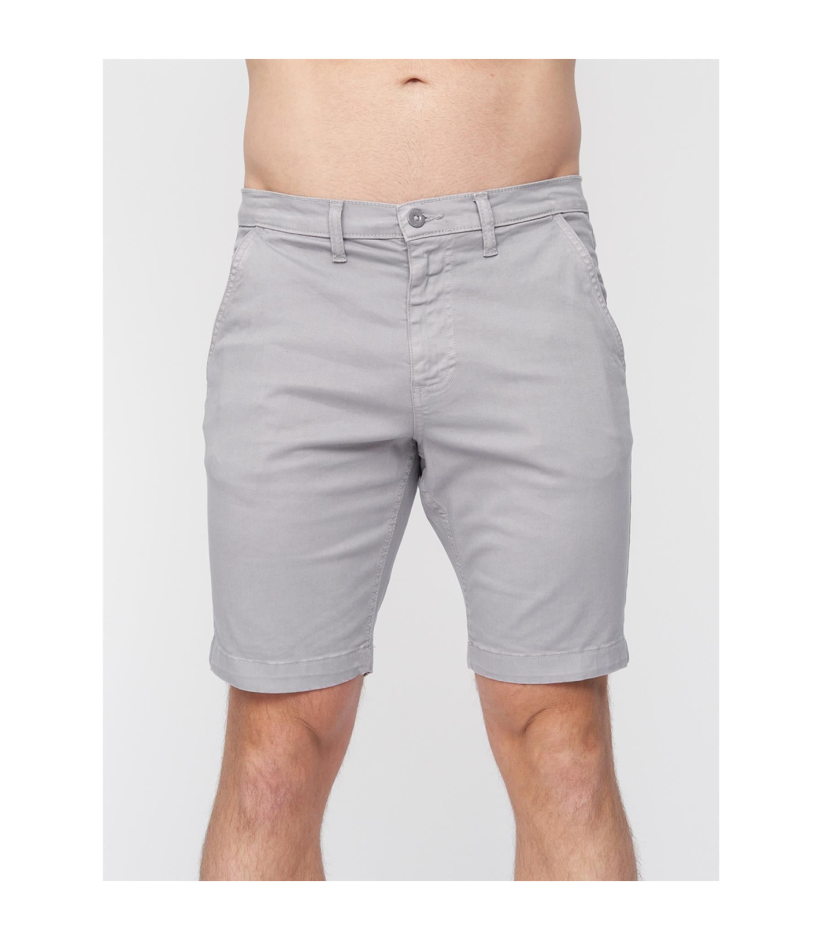 Men's Chino Short lightweight canvas inner waistband facing and inner pocket bags. Dtm coated metal button fastening to waistband, zip fastening fly, angled front side entry pocket and inner penny pocket with self colour rubber print. Welt back pockets, back yoke, twin-needle stitched outer leg seams and matching colour thread top stitching throughout.
