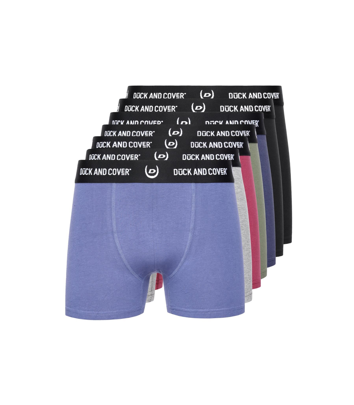 Mens 7 pack sustainable boxershorts with woven jacquard waistband. Packaged in a 7 pack natural card box with rotating hanger hook.