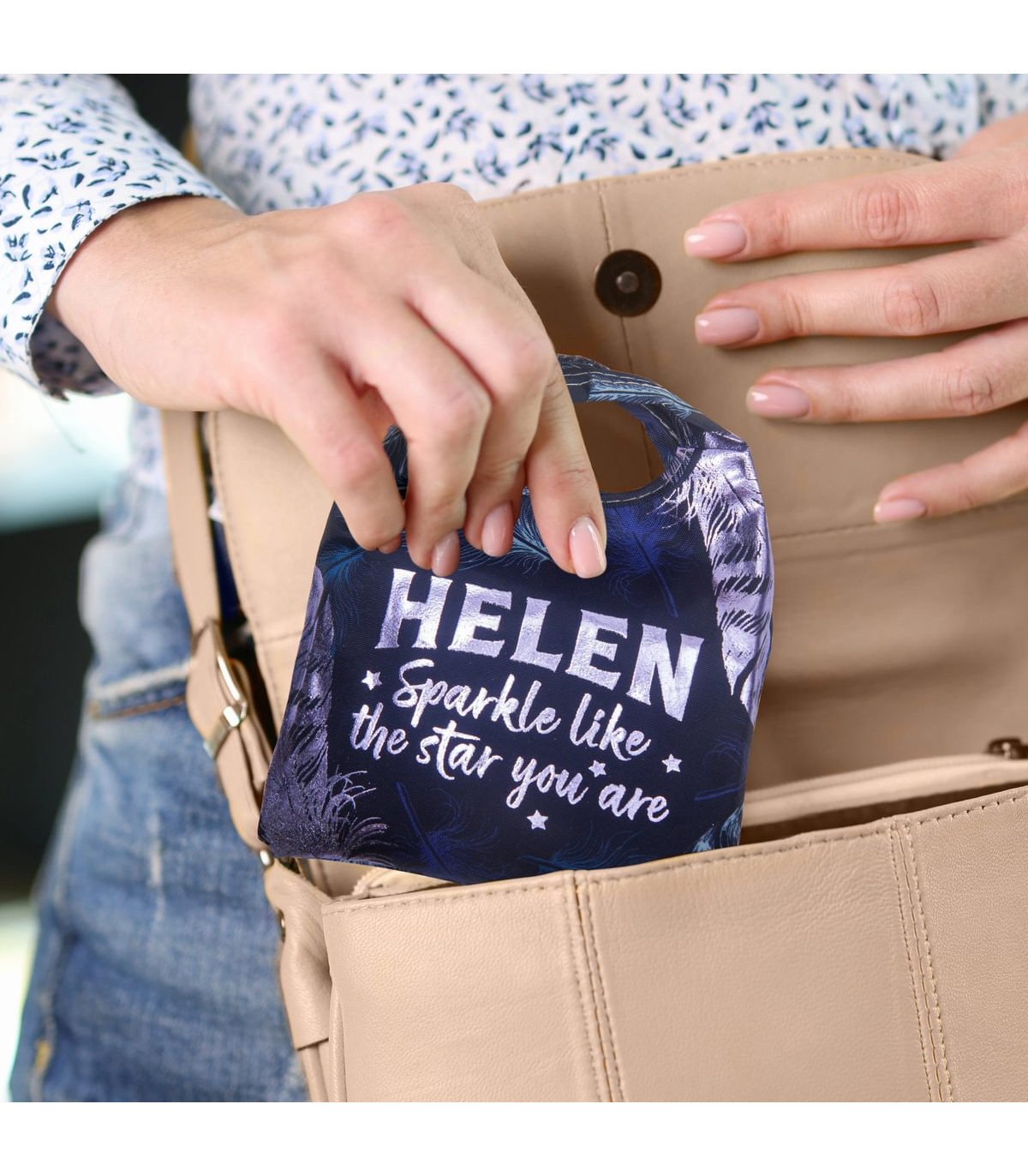 The perfect blend of sustainability, style, and practicality. The personalised Sparkle Shopper Bag is reusable and reduces the need for single-use plastic bags, helping to minimise environmental waste. The sparkly pouch is pre-personalised with popular names and fun sentiment, the shopper adds a personal touch that reflects your personality. Versatile and durable and a lovely gift idea, the tote is ideal for shopping and folds away in its own sparkly pouch to easily pop in your handbag until you need it again! PLEASE NOTE: These items are pre-personalised. The item you receive is the name or title that you have selected. Items are not personalised to order and we do not offer bespoke customisation.