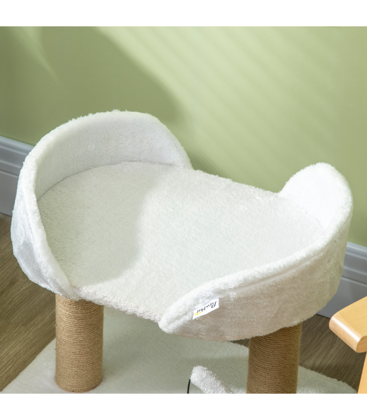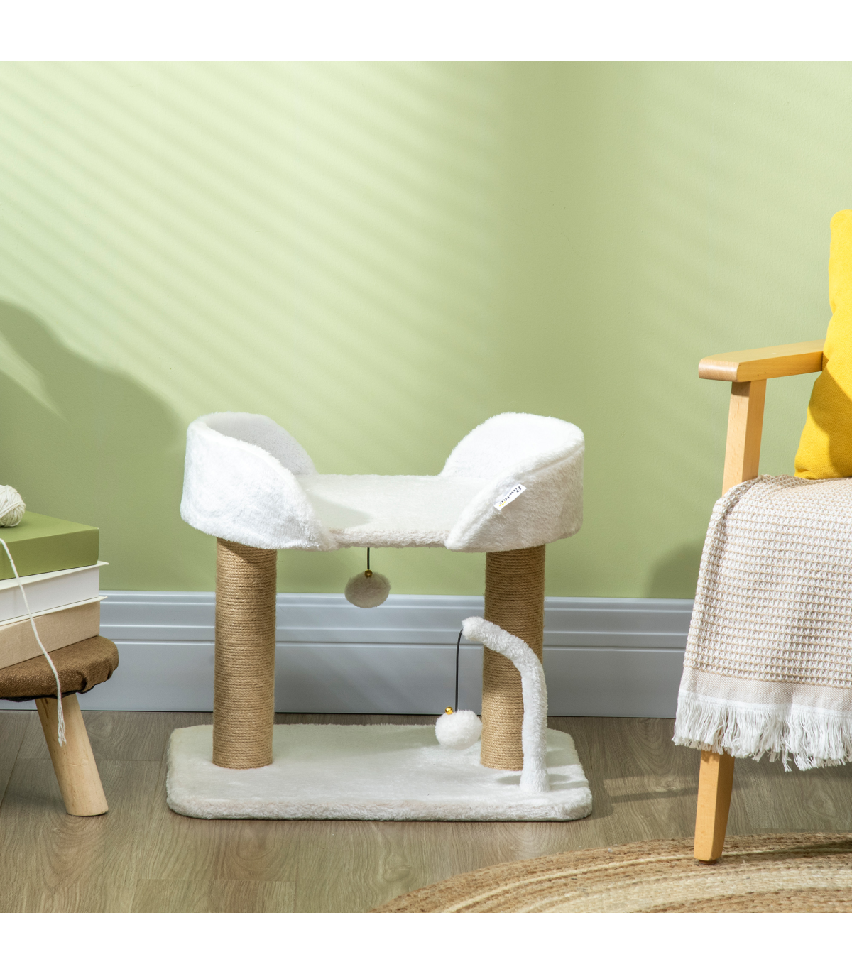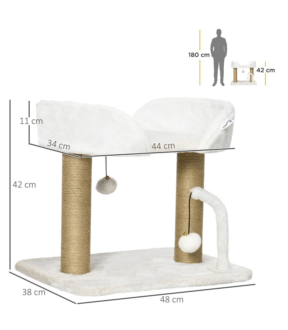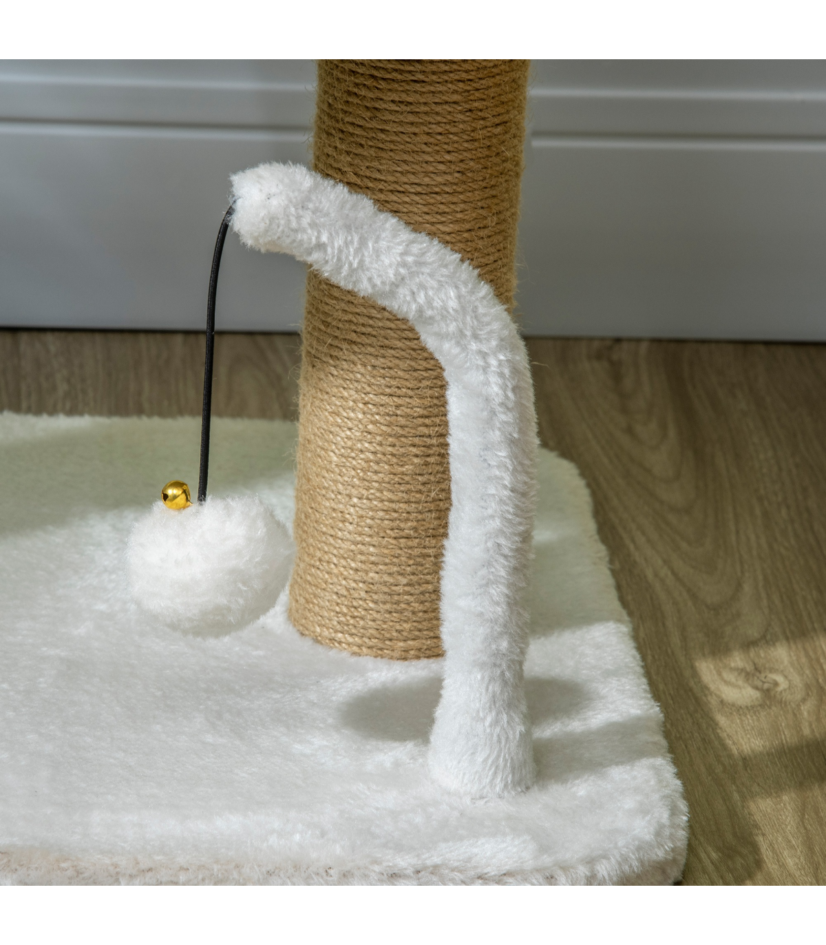Features: - Jute scratching posts to deter cats from using furniture - Covered in soft 100% polyester fabric for comfort - Made from sturdy particle board for stability - Includes hanging toy balls for entertainment - Dimensions: 42H x 48L x 38Wcm - Maximum load: 10kg - Suitable for cats under 5kg - Assembly required This White Jute Scratching Post Cat Tree Tower is the perfect indoor play area for your feline friend. With jute scratching posts to keep their claws busy and away from your furniture, this cat tree tower is covered in soft 100% polyester fabric for a cozy and relaxing space. The sturdy particle board construction ensures stability as your pets play, climb, and rest. The hanging toy balls provide entertainment for your cat, making it the ideal modern cat tree for your home. Dimensions: - Height: 42cm - Length: 48cm - Width: 38cm - Weight: 16.3kg - Colour: White