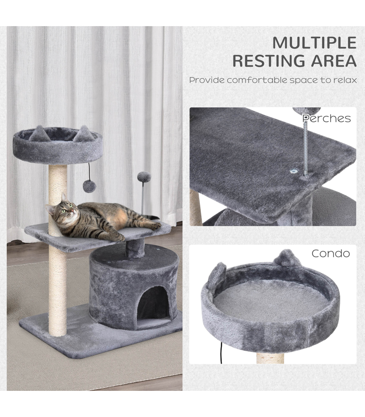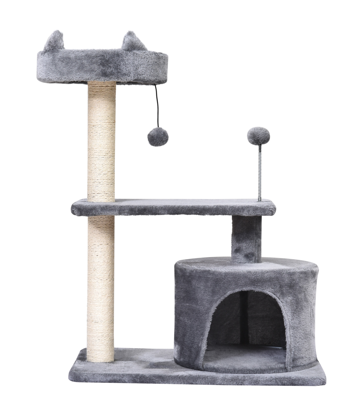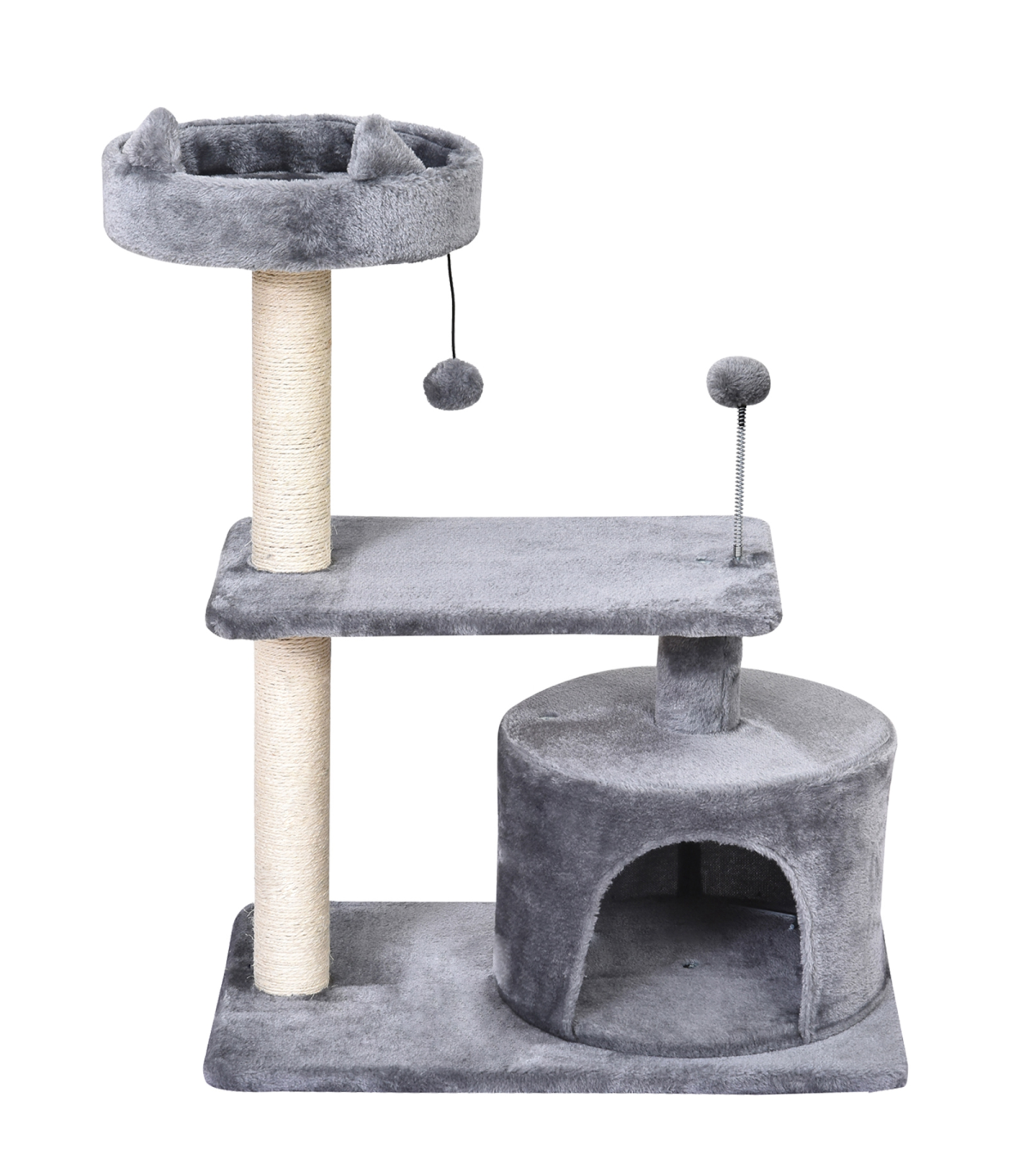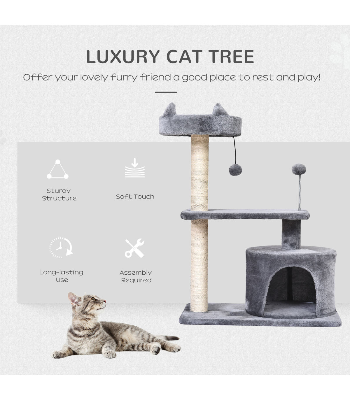 Never leave your cat bored alone again with this PawHut cat tree. A three-tier design, it combines a top round perch with cat ears for a cute look, a large middle platform, a large round house for them to hideaway in, a spring play ball that will perk up their energy and a hanging play ball for extra fun. Using particle board for a tough and durable core, the frame is covered in soft plush to prevent any fraction to your cat or kitten's fur for safety, whilst the large bottom base helps keep the tree balanced. The perfect place for them to rest and play all day.