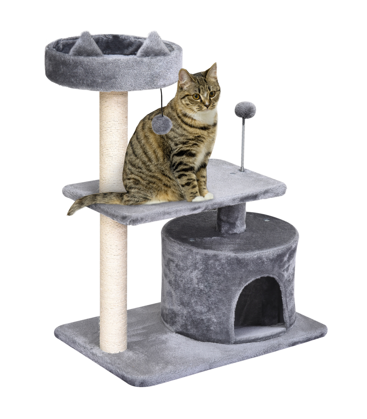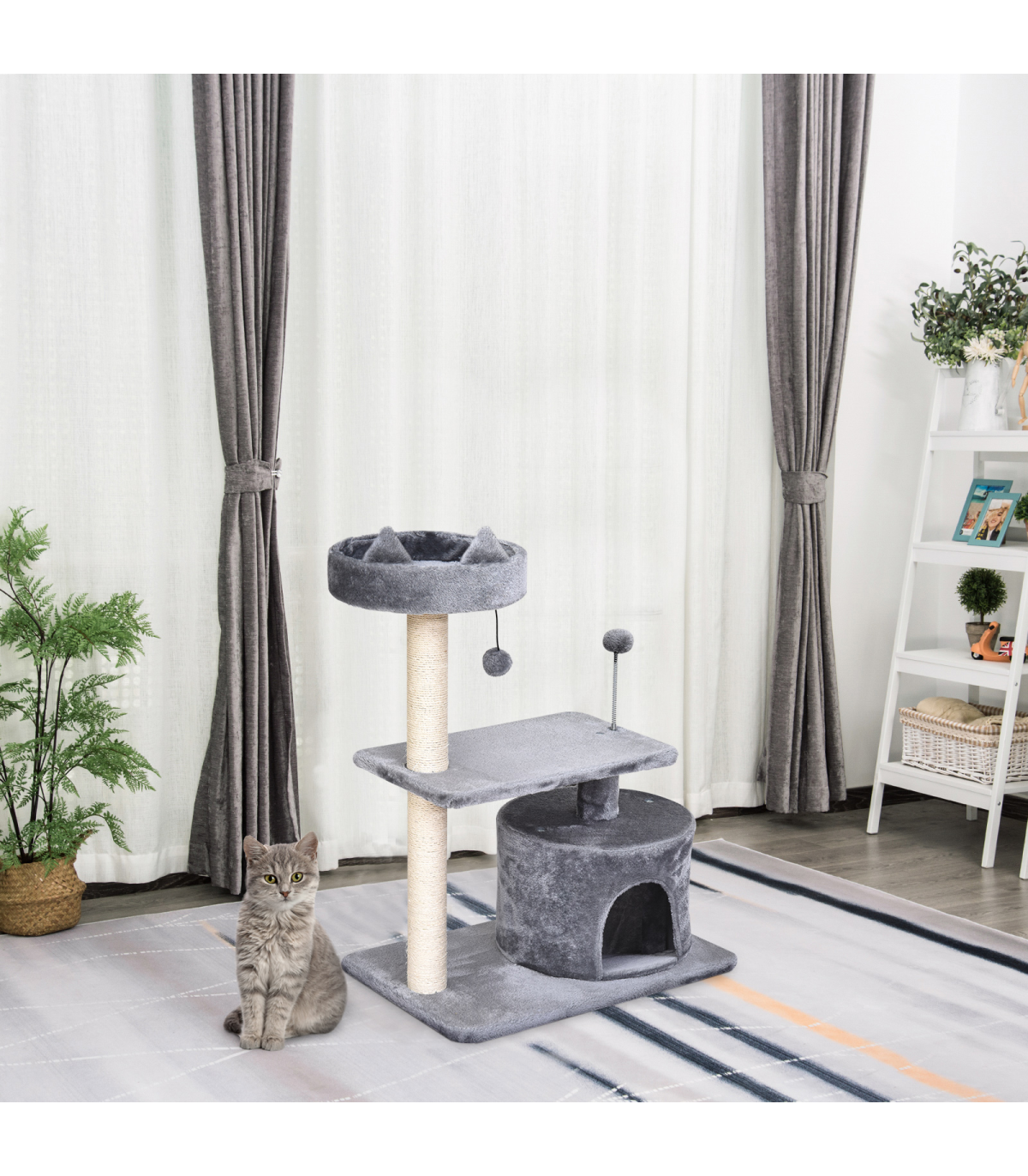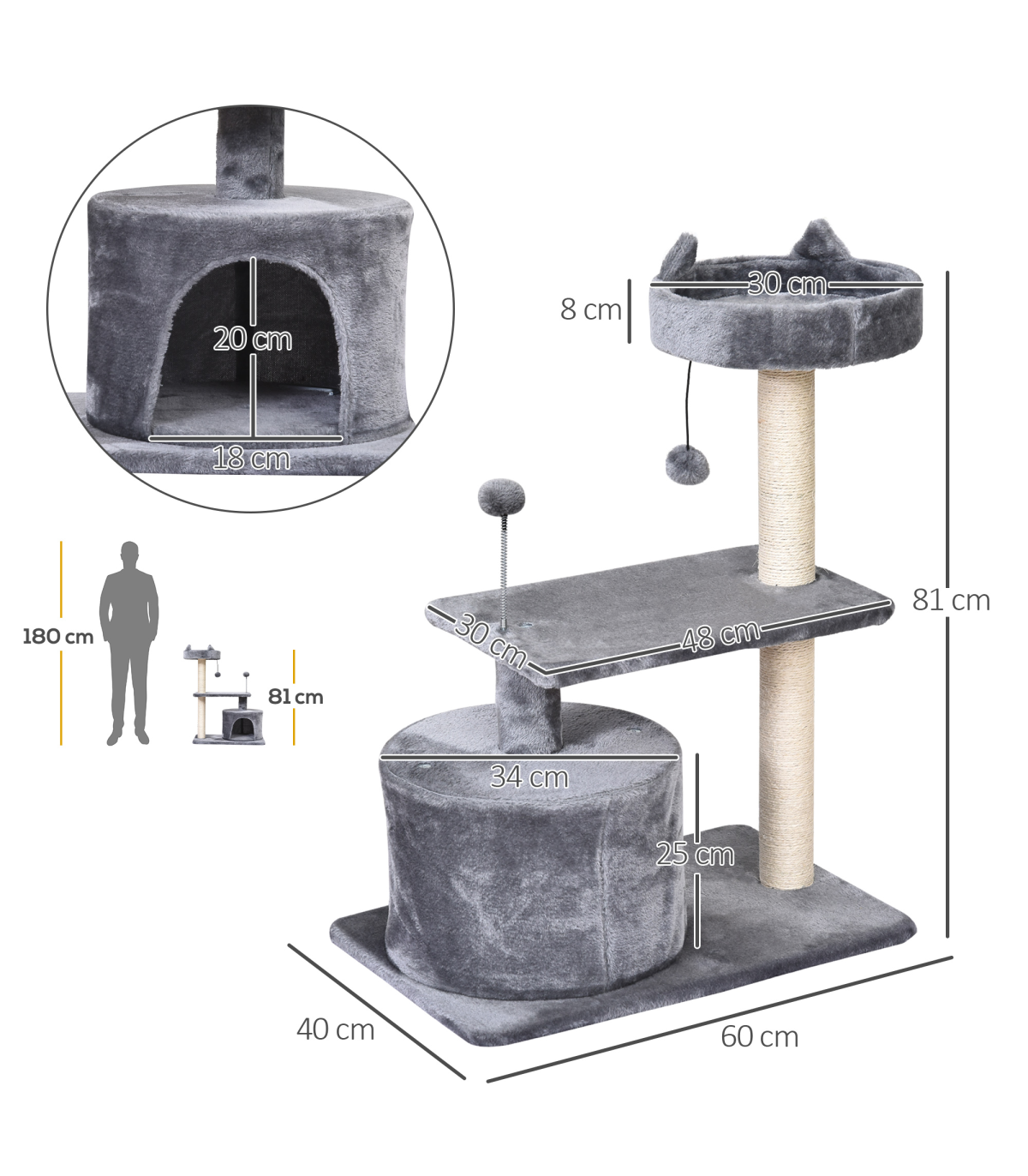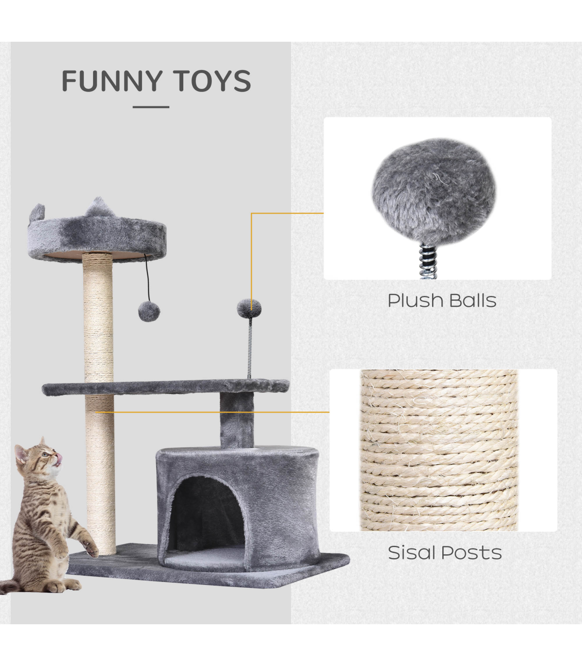 Never leave your cat bored alone again with this PawHut cat tree. A three-tier design, it combines a top round perch with cat ears for a cute look, a large middle platform, a large round house for them to hideaway in, a spring play ball that will perk up their energy and a hanging play ball for extra fun. Using particle board for a tough and durable core, the frame is covered in soft plush to prevent any fraction to your cat or kitten's fur for safety, whilst the large bottom base helps keep the tree balanced. The perfect place for them to rest and play all day.