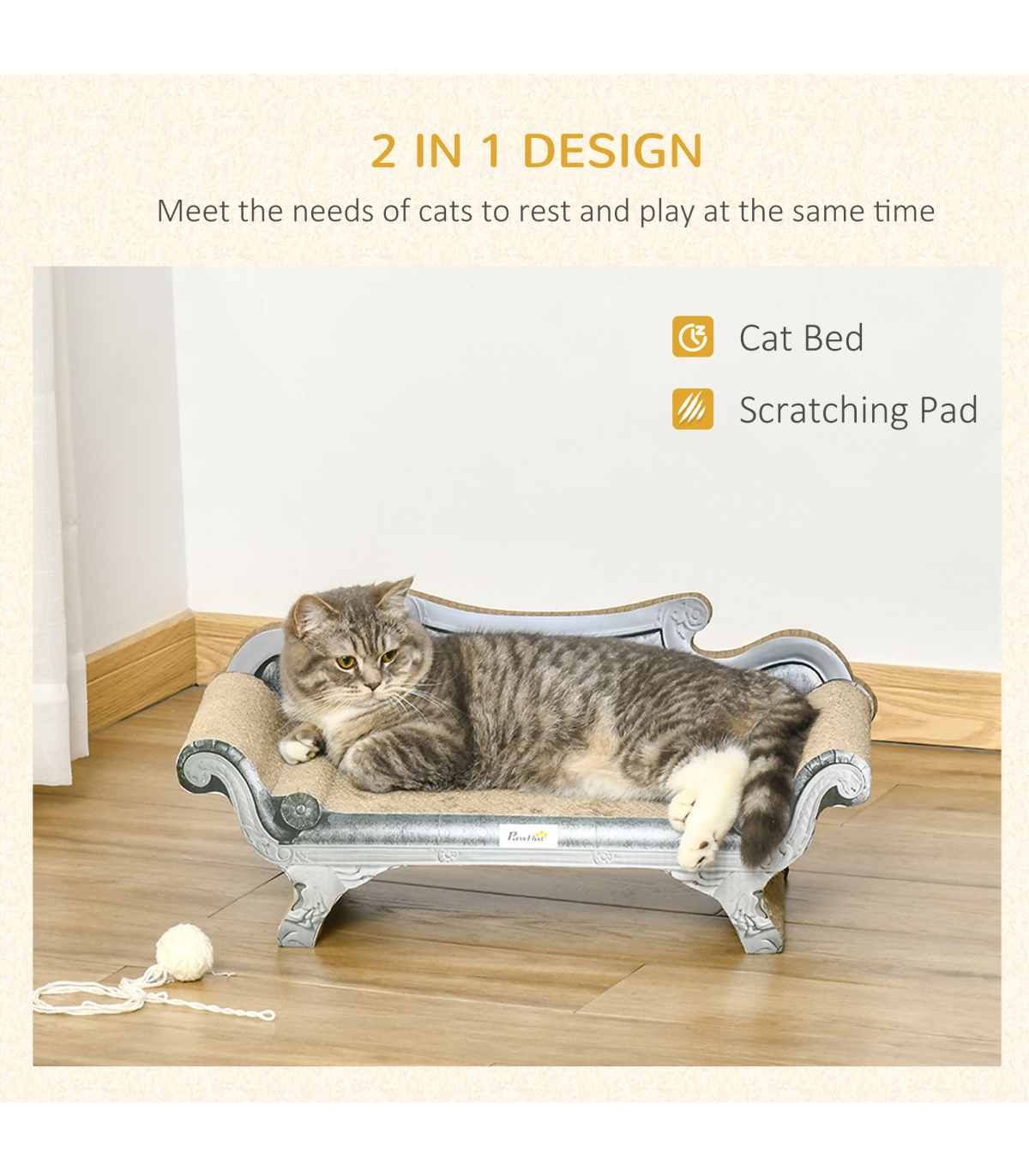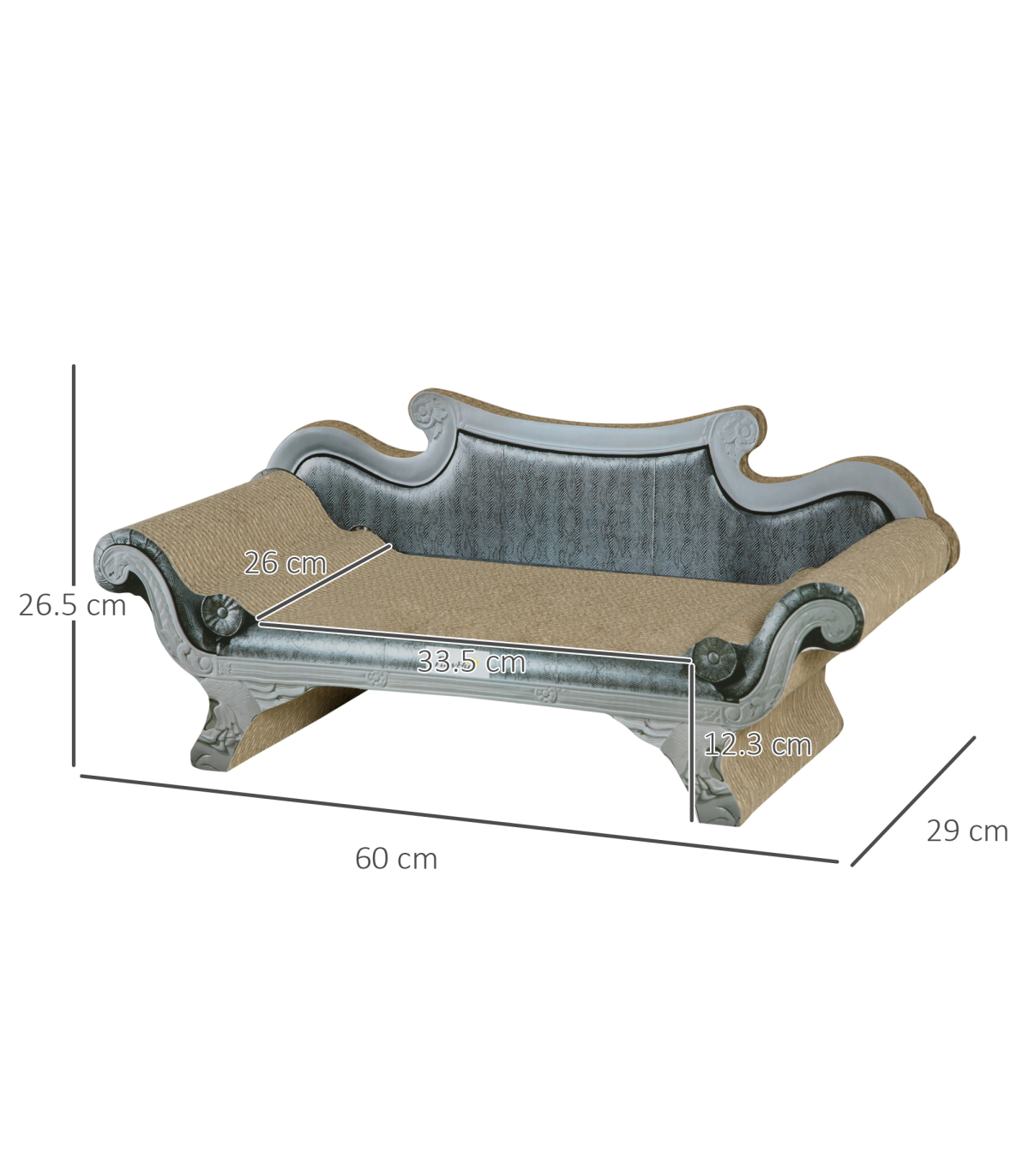 - Colour: Brown - Material: Corrugated Cardboard - Overall Dimensions: 60L x 29W x 26.5H cm - Seat Size: 33.5L x 26W cm - Off the ground: 12.3 cm - Armrest Height: 6.2 cm (from the seat) - Backrest Height: 13.5 cm (from the seat) This Brown Cardboard Cat Scratcher Lounger Bed is the perfect combination of comfort and entertainment for your feline friend. Made from durable corrugated cardboard, this lounger bed provides a cozy spot for your cat to relax while also serving as a scratching board to help keep their claws healthy. The included catnip will entice your cat to use the lounger bed, providing hours of fun and relaxation. - Dimensions: 26.5H x 60L x 29W cm - Weight: 1.40 kg - Colour: Brown