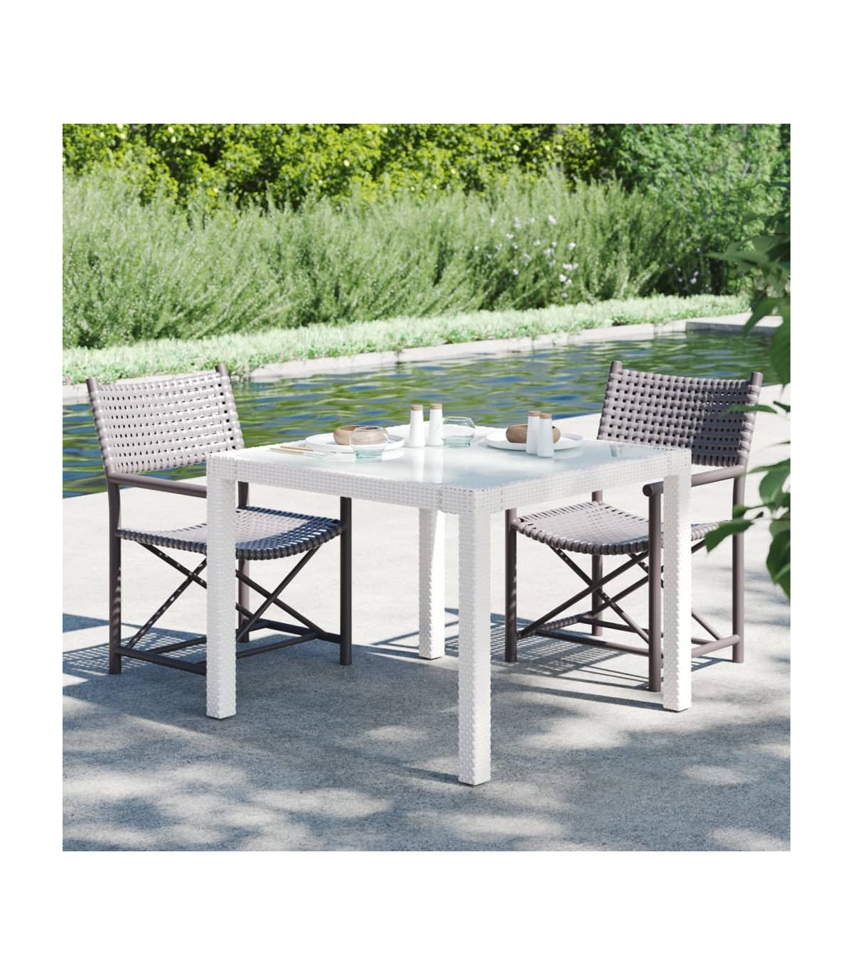 - Material: Poly rattan, powder-coated steel, tempered glass