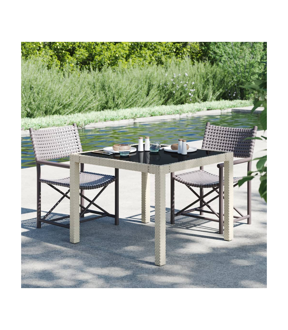 Enhance your outdoor living space with this elegant beige poly rattan garden table. Perfect for garden, patio, or any outdoor setting, this table combines style with functionality. Its sturdy powder-coated steel frame is wrapped in durable poly rattan, topped with a sleek tempered glass surface that's easy to clean. Lightweight yet stable, this table is designed for both convenience and longevity.